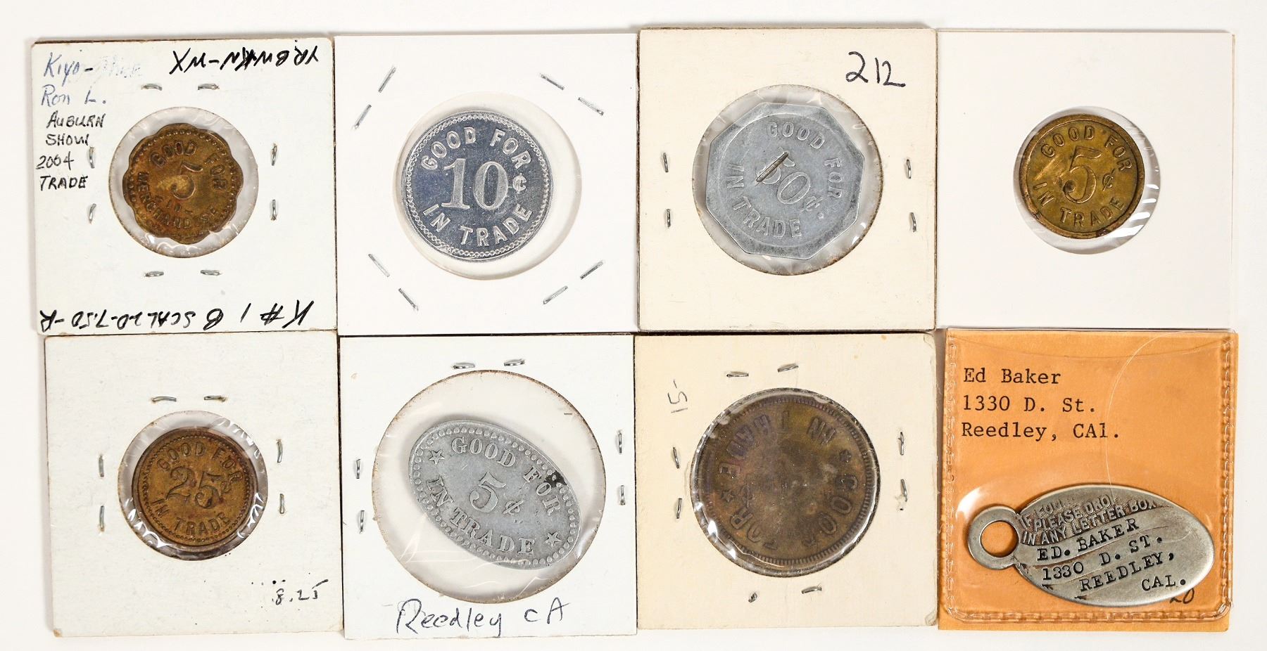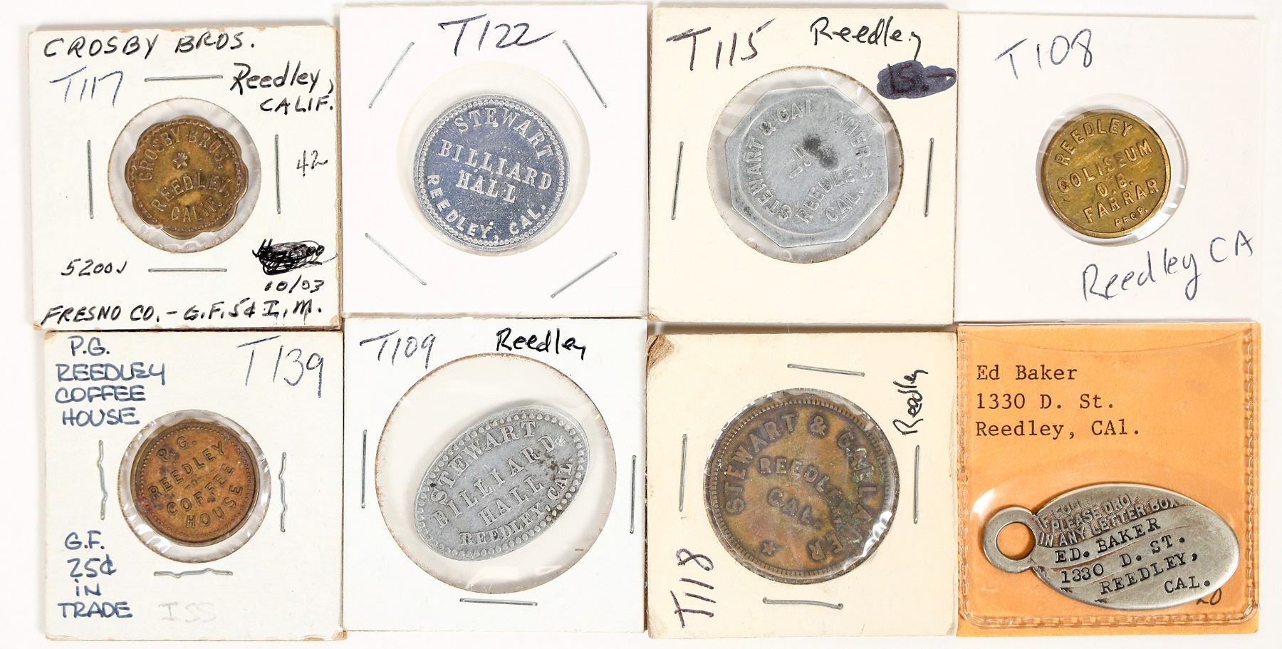 Group of eight tokens from the Fresno County town of Reedley: Reedley Coffee House; Ed Baker; Reedley Coliseum; Stewart & Gallegher (2); Stewart Billiard Hall (2); Crosby Bros.
