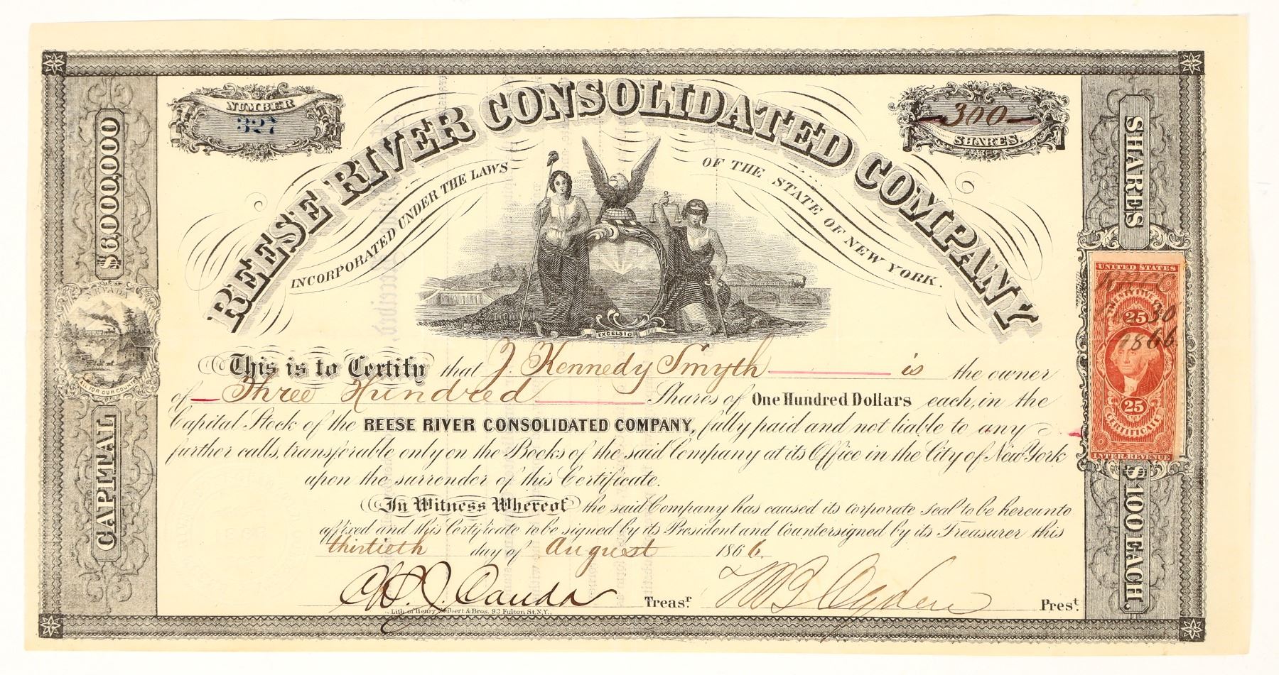 Inc. in New York. No. 327, issued for 300 shares to J. Kennedy Smyth on August 30th, 1866. Signed by president Ogden and the treasurer (illegible). Not cancelled. Black border and print on thin paper. Allegorical vignette at center with two women and an eagle. Small Nevada state seal vignette on the left border. Printed by Henry Seibert & Bros., NY. One 25 cent adhesive revenue stamp at right, pen cancelled. 6 x 11.5" Horizontal and vertical folds, dog ear corner. Clean. According to Raymond, 1872, the properties of this company were purchased by the Manhattan and consisted of about forty claims on Lander and Union hills including the Whitlatch Union, Whitlatch Yankee Blade, Savage, Wall, Isabella, and many more. The Reese River Cons. Co. was "in some way entangled in the affairs of the First National Bank of Nevada, which failed, and the mines were sold by the sheriff, for $60,000, to the Manhattan Company" (pg.170).