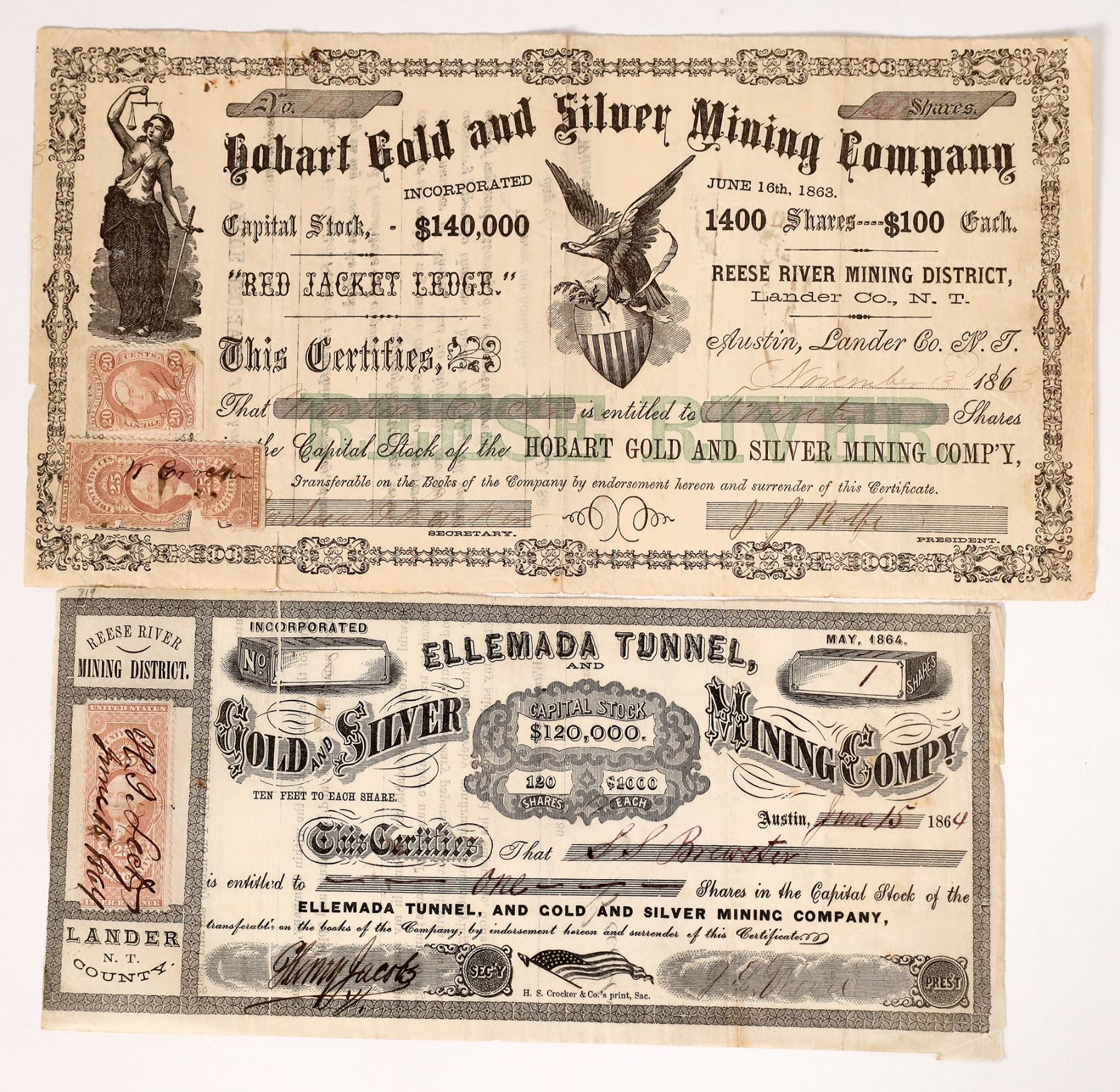 Lot of 2 stock for Reese River district, datelined in Austin. Includes 1)Hobart Gold & Silver Mining Company Stock. This is a certificate with questions! Number 113(?) for 20 shares to Winslow Crocker. Datelined Austin, Lander Co. N. T. (in fancy script), 1863. Signed by president JJ Rolfe and secretary Backer(?). Incorporated June 16, 1863. Located on Red Jacket Ledge in the Reese River Mining District, Lander Co., N. T. Semi-nude lady liberty vignette. Also an eagle holding a shield. No printer mentioned. 25c torn Certificate Revenue stamp and smaller 20c Exchange revenue stamp attached. Faded names. Cert is fragile from over 150 years of wear and tear. QUESTION 1: Was it named for Comstock Lumber King WS Hobart?. QUESTION 2: Was it located in Ophir Canon?. QUESTION 3: Was the secretary Winslow Crocker from San Francisco? QUESTION 4: Was the secretary Winslow Crocket from Aurora? 2) Ellemada Tunnel and Gold and Silver Mining Company Stock. VERY EARLY NUMBER 8 for 1 share to SS Brewster. Signed by Henry Jacobs and president G Wood. Dateline Austin June 15, 1864. Incorporated May 1864. Location Reese River Mining District, Lander N. T. County. Number and shares inside silver bars. Fancy script text. HS Crocker printer. Ten feet to one share. One of two stocks for this company listed in Mahler. Vertical folds. Bottom right corner mis-cut. Overall, in very nice condition. 25c Power of Att'y Revenue stamp. Jacobs was secretary of the Union Party, supporting Abraham Lincoln, in Nevada. Woods was a Reese River miner. Historical background on Jacobs, Woods and the mine is included.