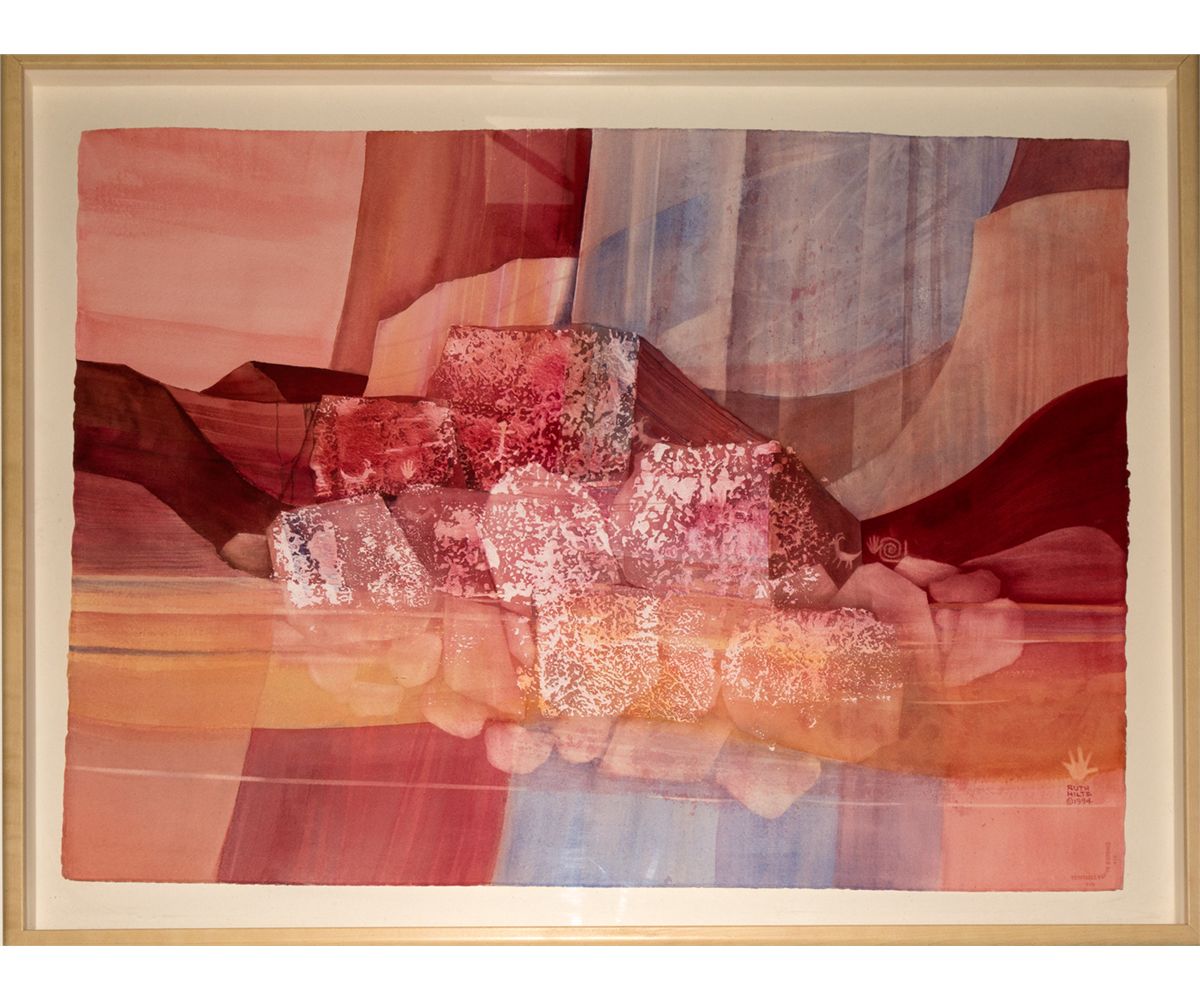 26x34" watercolor and gesso by Ruth Hilts. A Native Nevadan, Ruth Hilts worked in several mediums over the years. The paintings reflect her love of the high desert country. She is noted for her "Nevada Earth' series in which she made pigments from soils, rocks and minerals of the Nevada desert. She has received several awards for her work, and her paintings are in many corporate collections, including the Nevada Museum of Art.