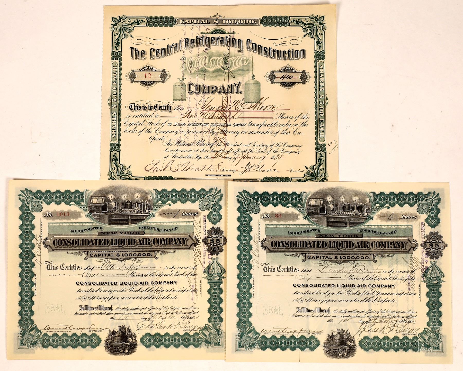 Three refrigeration and liquid air company stock certificates from the states of Kentucky and New York, c1889-1903. Included are: The Central Refrigerating Construction, Louisville, KY, No. 12, 400 shares issued to the company president, George H. Moore Jan. 26, 1889, uncanceled, signed by G. H. Moore and Secretary Stratton, has refrigeration coils vignette, embossed seal and ornate border, fine condition with two folds and minor tears on edges; and two Consolidated Liquid Air Company stock certificates, inc. New York, No. 83, 6 shares issued in 1903 to Douglas E. Brinton, uncanceled, signed by president and secretary, and No. 1013, one share issued in 1903 to Otto Dobert, uncanceled, signed by president and secretary, both with vignettes of liquid air machine and possibly a bee hive, with embossed seals, ornate borders, fine condition with two minor folds each.