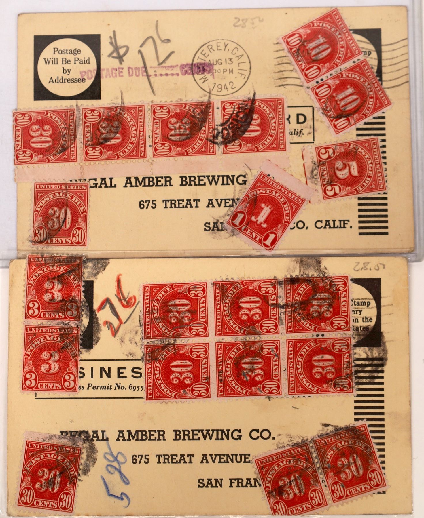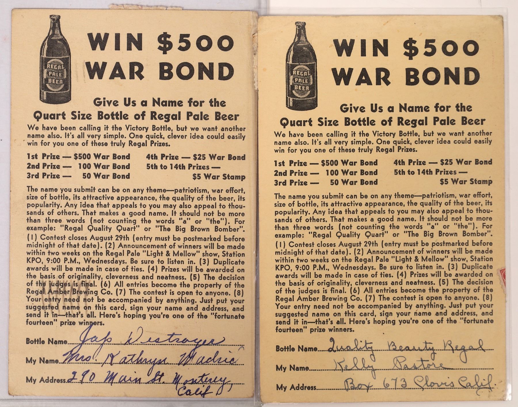 These two postcards were par advertising and part contest. They were looking for a name for their victory bottle. Winner gets a $500 war bond. The two .two names submitted on these cards were 'Quality Beauty Regal' and 'Jap Destroyer' [WOW]. Fronts are covered in Red 1c, 3c, 10c and 30c red postage stamps. Unique and interesting.