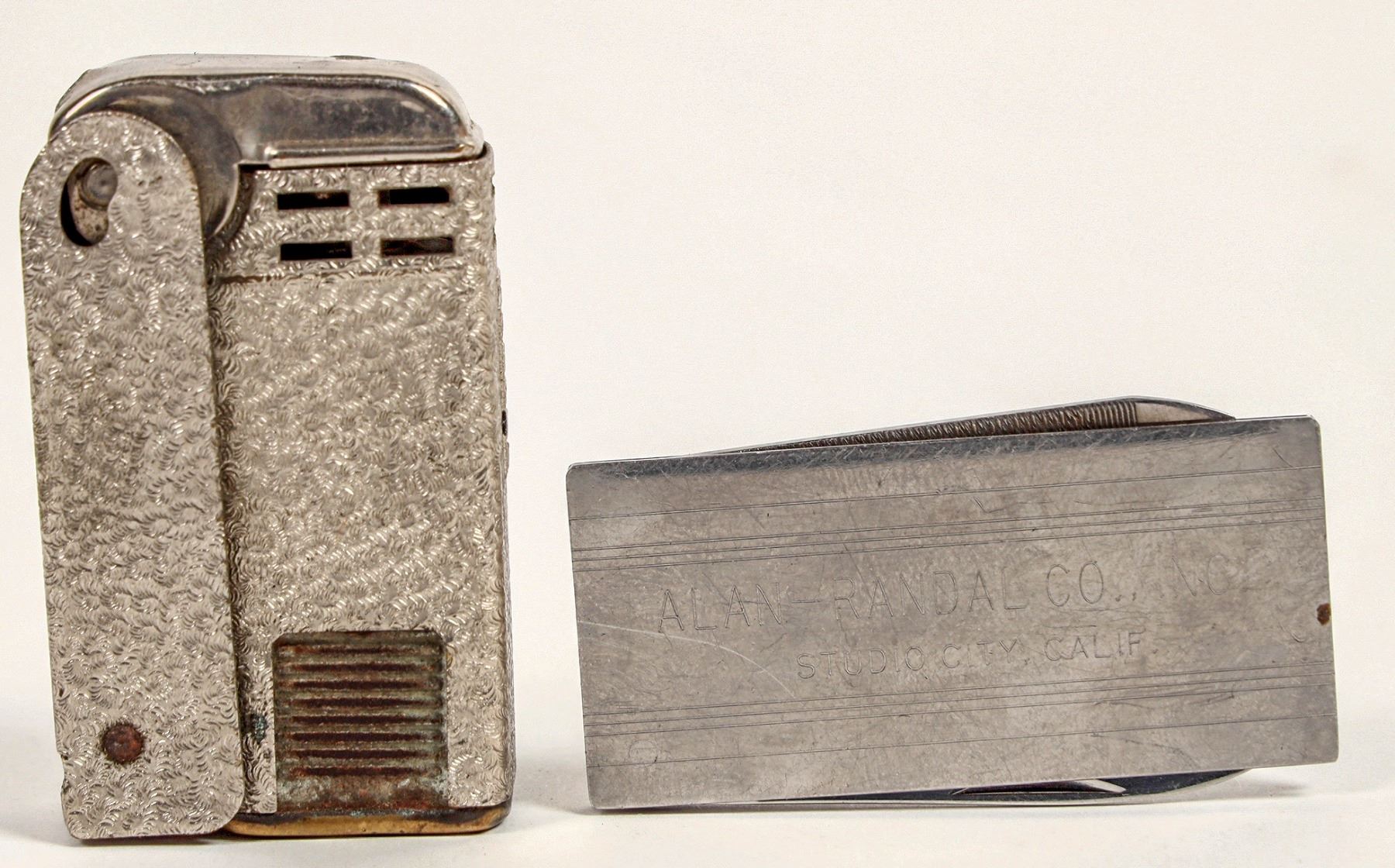 Vintage rare Regens cigarette lighter, made in U. S. A. Two bladed pocket knife (2 x 1 inches) engraved Alan-Randal Co., Inc. Studio City, Calif.