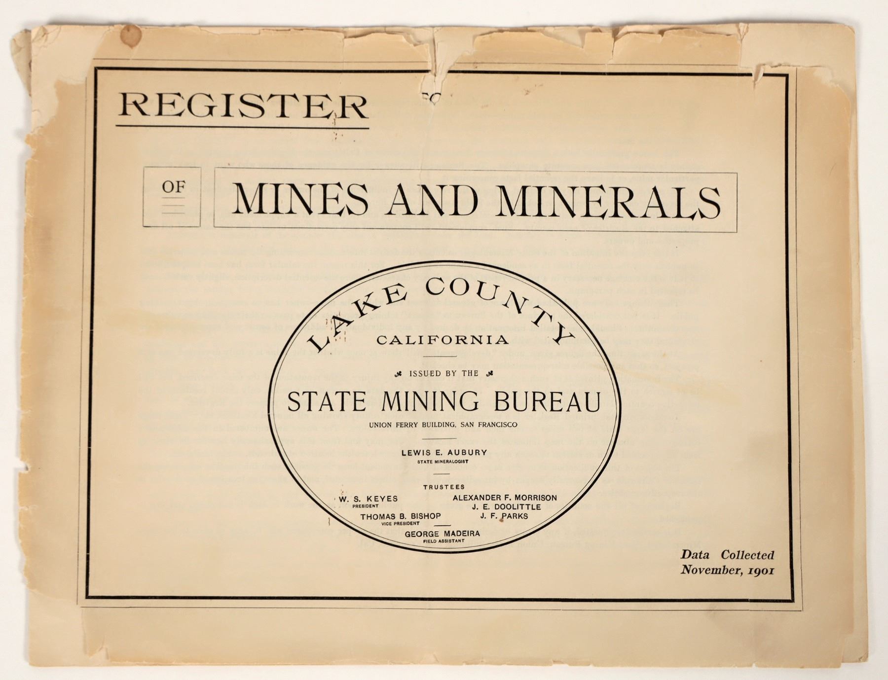 Register of Mines & Minerals, Lake County, California, 1901. By the State Mining Bureau. 12pp. Quicksilver and mineral springs dominate. Covers detached, many tears. Information is still readable and very useful. 9 x 11.5"