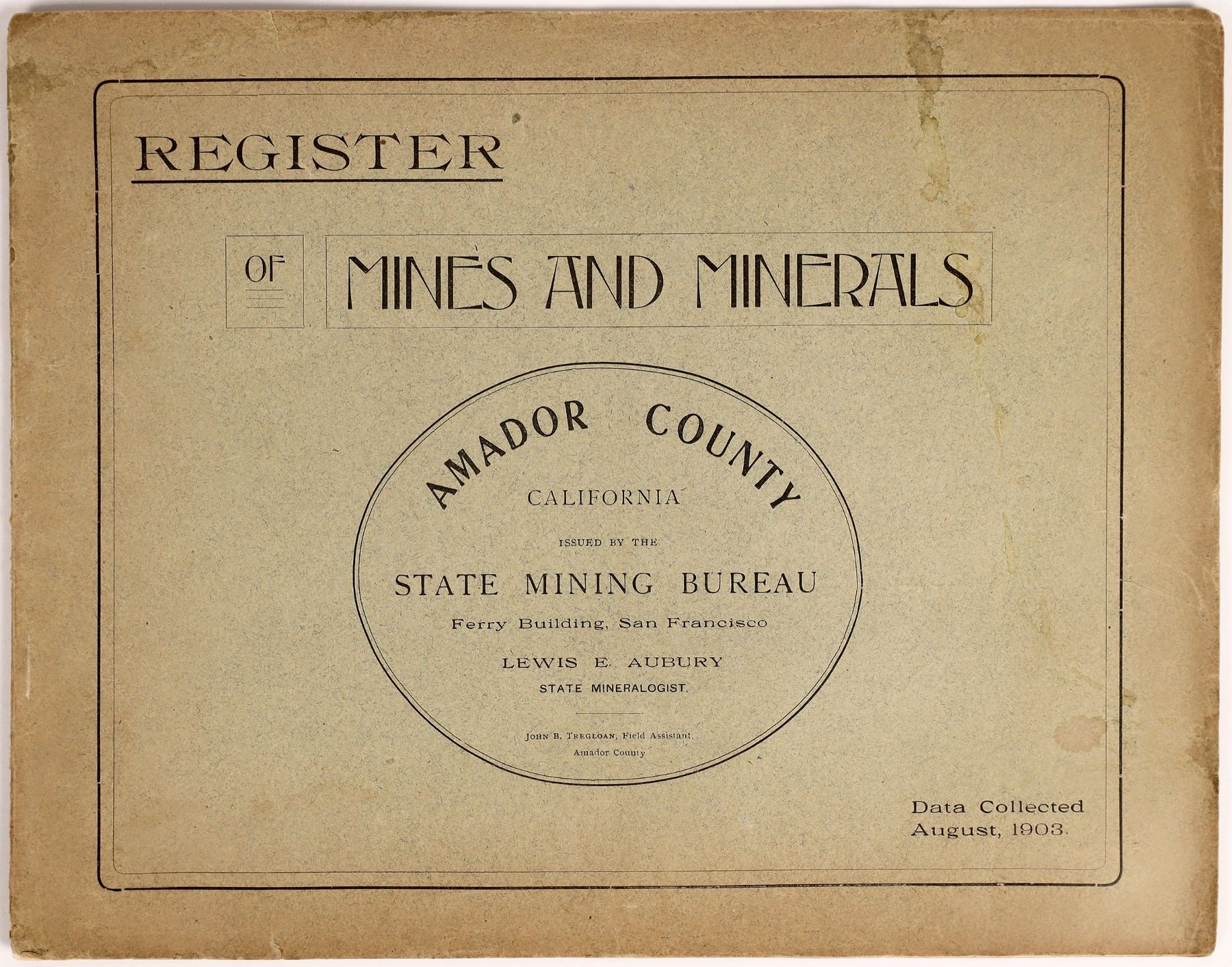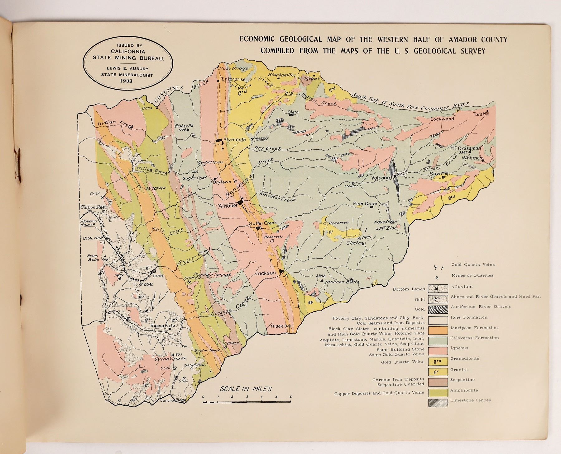 Issued by the State Mining Bureau, Lewis E. Aubury state mineralogist. Data Collected August 1903. Paper wrappers, strong binding. Has a full-page color Economic Geological Map of the Western Half of Amador County. Bulk is detailed table listing Mine Name, Nearest Town, Location, Character of Ore, Hanging Wall, Foot Wall, Developments, Company Owner or Supt., and Remarks. Information for over 200 mines. About 20 pp. 9.25 x 11.75" Stains, toning.