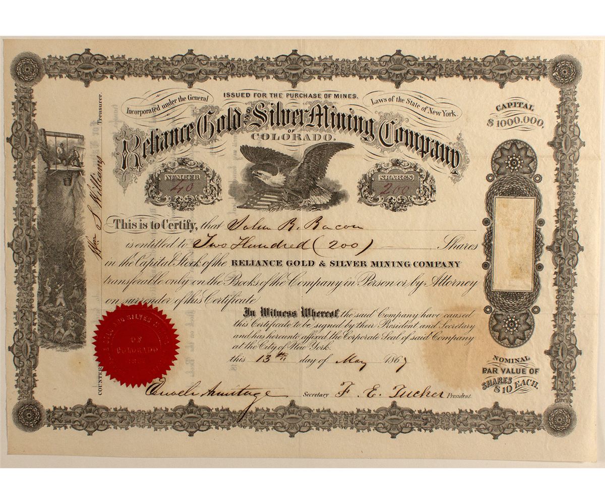Inc. in New York in 1867. No. 40. Uncancelled. Issued for 200 shares to John B. Bacon on May 13th, 1867. Signed by F.E. Tucker (president) and Quach Armitage (secretary). Countersigned by Wm. S. Williams (treasurer). Red company seal at lower left. Two vignettes: eagle on a patriotic shield (top center) and miners hoisting buckets (left). Reverse is not signed. No printer listed. Measures 12 ¾" x 9." Condition: soiled impression of seal (from stock folded?) and light foxing.City: Black HawkCounty: GilpinState: CODate: 1867