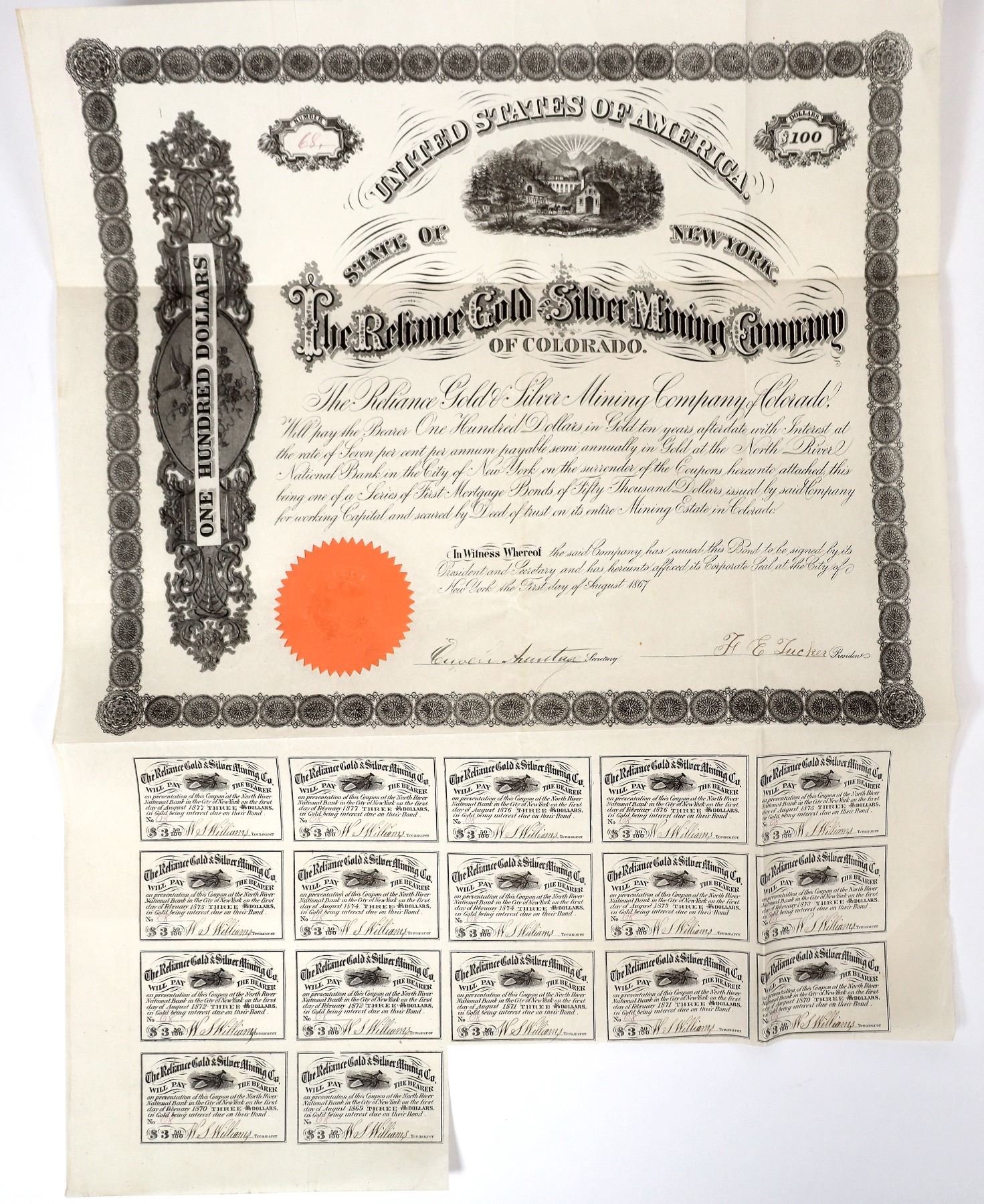 Very early. $100 bond no. 68, issued in August 1867 in New York. Signed by president FE Tucker and secretary Armitage. Not cancelled. Black border and print, orange seal, and elaborate mining vignette. No printer listed. Seventeen coupons still attached. 20 x 16" Folds, very clean. Not mentioned in Hollister or Corbett. According to an article in the Daily Central City Register (February 12, 1869), the company owned the Minnesota Lode in Russell Gulch. They have driven a shaft 133ft. In the west end of the drift, there are more than 5 ft. of sulphuret ore of iron. Assays are $87 per ton. Formerly, the mine produced gold from decomposed surface workings. "The mine is dry and comfortable and properly worked." Russell Gulch is located about two miles southwest of Central City, Colorado. It was founded by William Greeneberry Russell when he discovered placer gold deposits in June 1859. This was the start of the Pikes Peak Gold Rush._x000D_