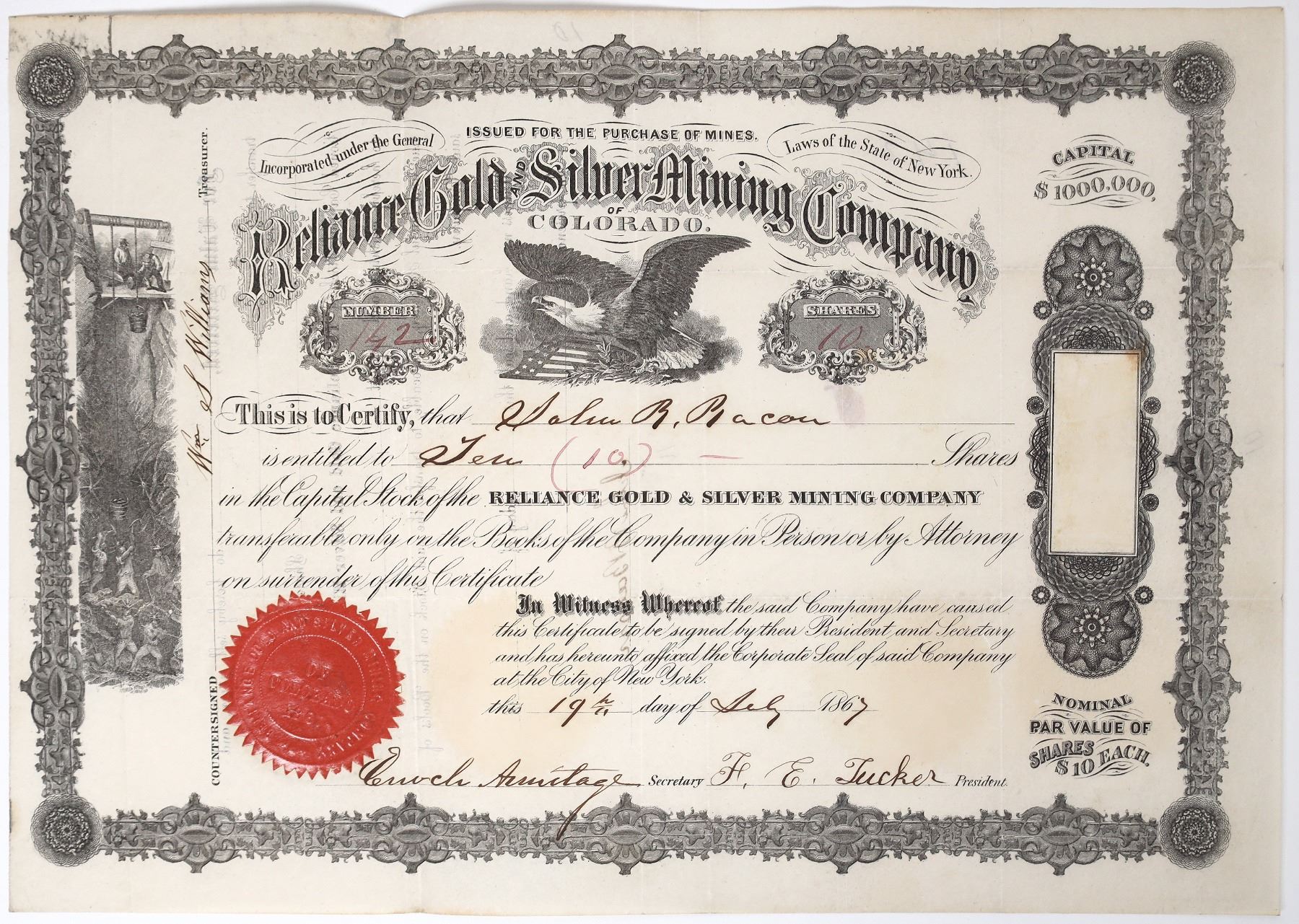 Very early. No. 142, issued to John B. Bacon for 10 shares in July 1867 in New York. Signed by president FE Tucker and secretary Armitage. Not cancelled. Black border and print, red seal. Two vignettes: eagle on shield (top center) and windlass mining scene (left). No printer listed. 9 x 12.5" Folds. Not mentioned in Hollister or Corbett. According to an article in the Daily Central City Register (February 12, 1869), the company owned the Minnesota Lode in Russell Gulch. They have driven a shaft 133ft. In the west end of the drift, there are more than 5 ft. of sulphuret ore of iron. Assays are $87 per ton. Formerly, the mine produced gold from decomposed surface workings. "The mine is dry and comfortable and properly worked." Russell Gulch is located about two miles southwest of Central City, Colorado. It was founded by William Greeneberry Russell when he discovered placer gold deposits in June 1859. This was the start of the Pikes Peak Gold Rush._x000D_