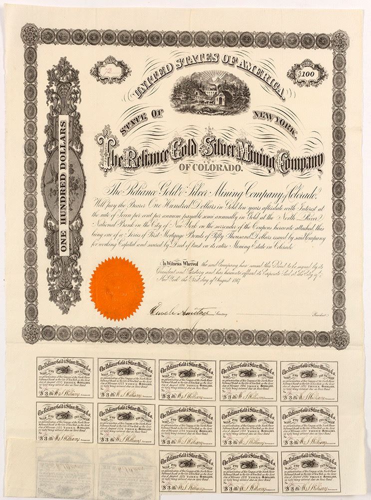 This $100 bond was issued in 1867 and signed by secretary Armitage and president Tucker. Number 72. 18 x 16". Excellent condition! Includes orange company seal. 17 coupons still attached. Gilpin County. Small mining/railroad vignette titled "All for our Country." Colorado Territory! (Al Adams Gold Rush Memorabilia Collection) Date: 1867 Location: Black Hawk, Colorado HWAC# 55049