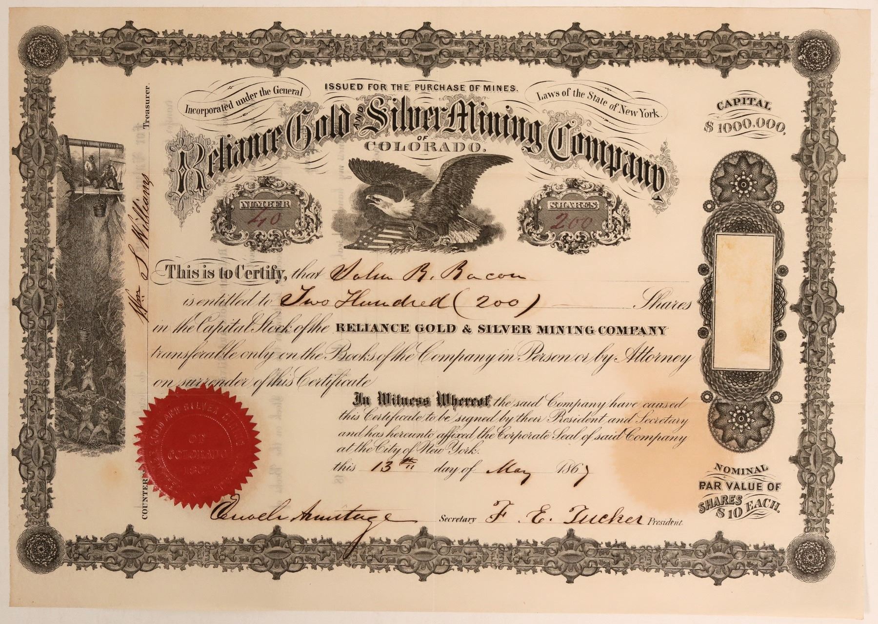 Red Corp embossed seal, Vignettes: Top eagle wings spread, left miners holding bucket. Printer not identified. VF. Corp. Seal impression from being folded left/right. State: New York City: Date: 1867