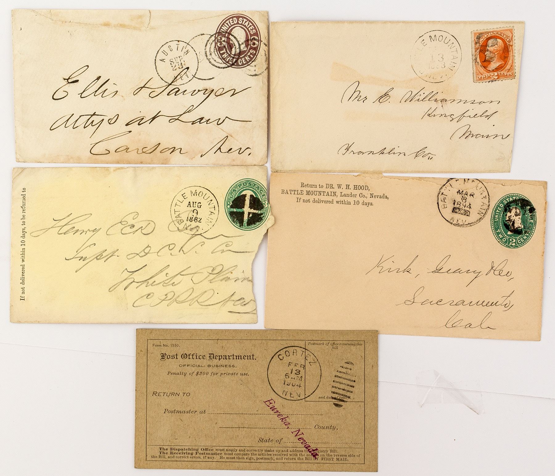 1) R-4 Cortez. 1904. Signed by H. Berry, a rare black Nevada citizen during this time period. 2) 1894 Battle Mountain with a cc' for Dr. W.H. Hood. Background information on Hood. 3) 1870's Battle Mountain with a fancy killer 'B.' 4) 1882 Battle Mountain to Henry Eck of White Plains. Historical information on Eck. 5) Early Austin cancel addressed to Ellis & Sawyer, attorneys in Carson City. Historical background on Sawyer including this sentence in his obituary, "He was a lawyer of more than average ability, but was his own worst enemy, being addicted to drink to such an extent that he was frequently incapacitated." State: Nevada City: Lander County HWAC#: 46683 Date: