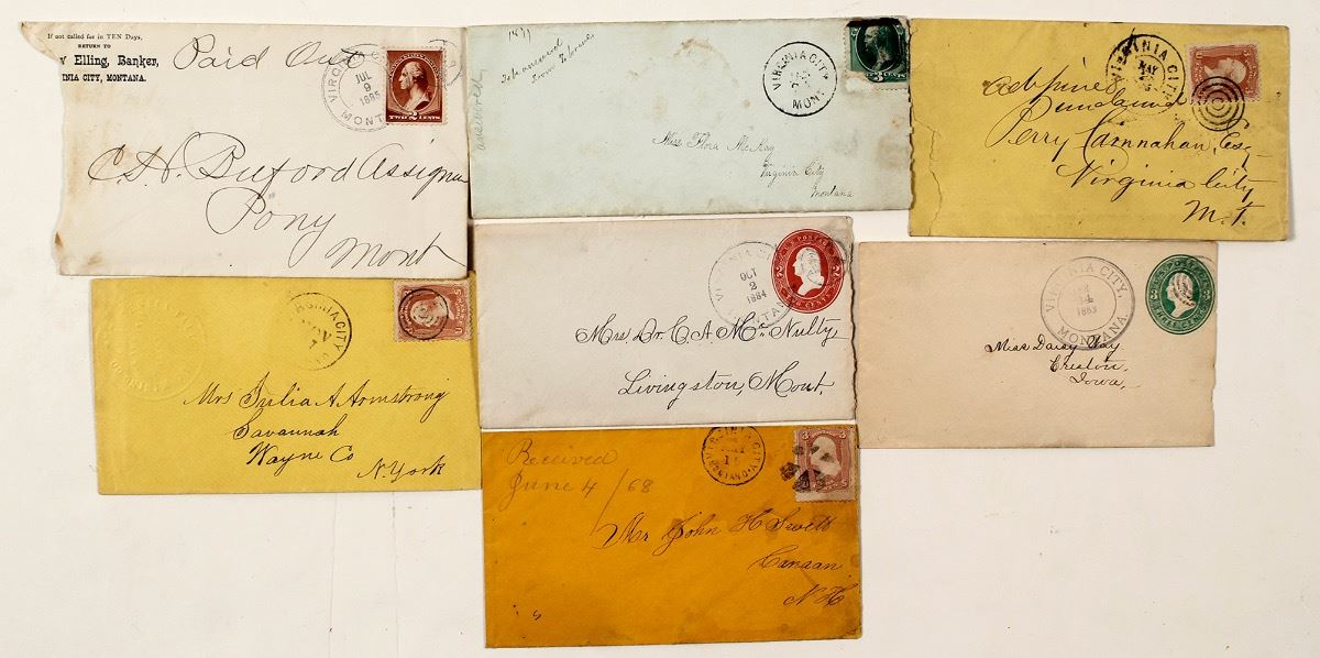 Lot of 7. 1) 1884 larger circle, unlisted in Shellen & Dunn. 2) Type 11 to Perry Carnahan. Written is "advertised & unclaimed.". 3) Type 9. 1883 double ring, double circle. 4) Type 10. Double ring, double circle with star in circle killer. Elling corner cover roughly opened. 1885. 5) Type 5. 1868 Montano. 6) Type 4 1865 cover. Has an imprinted stamp for the 'Seneca Falls Gold Mining Company.' 7) Type 7. 1877. City: Virginia City State: Montana Date: 1878-1889 ID: 36743