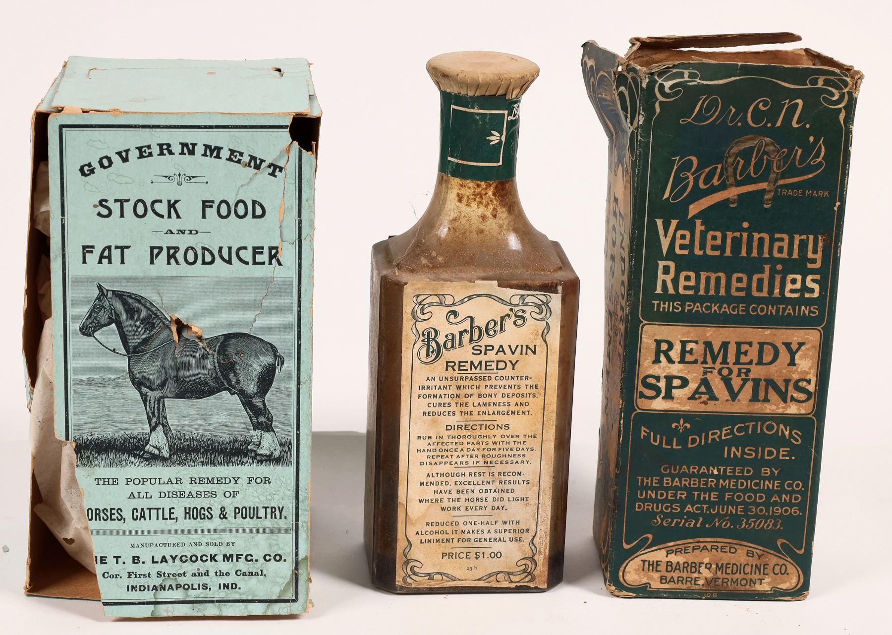 The Government Stock Food and Fat Producer blue box, 6x3x3", 1 flap detached, corner chip and large side tear. Dr. C N Barber's Remedy for Spavins, 6.5x2x2.5". Tears, top flap missing, original bottle with some contents.