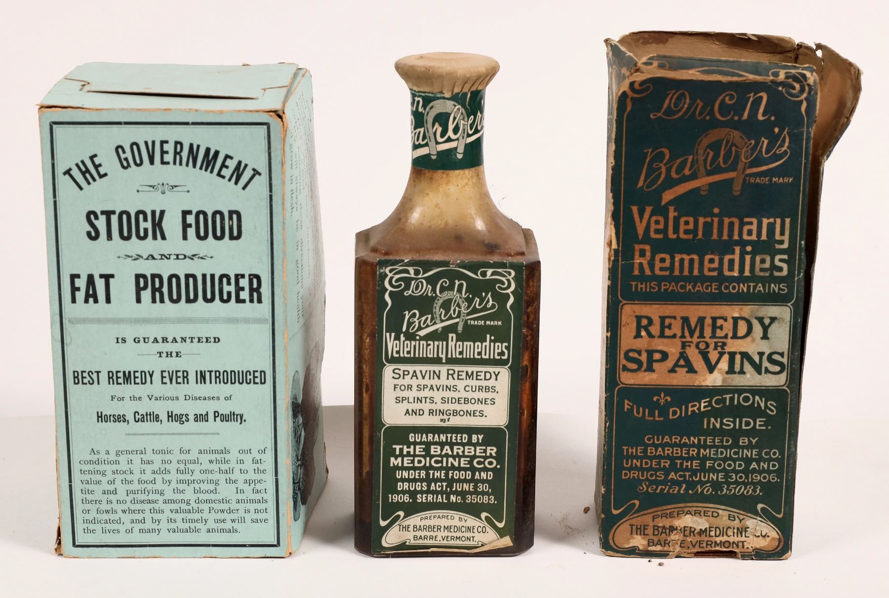 The Government Stock Food and Fat Producer blue box, 6x3x3", 1 flap detached, corner chip and large side tear. Dr. C N Barber's Remedy for Spavins, 6.5x2x2.5". Tears, top flap missing, original bottle with some contents. Jim & Barbara Sherman Private Western Mining Museum