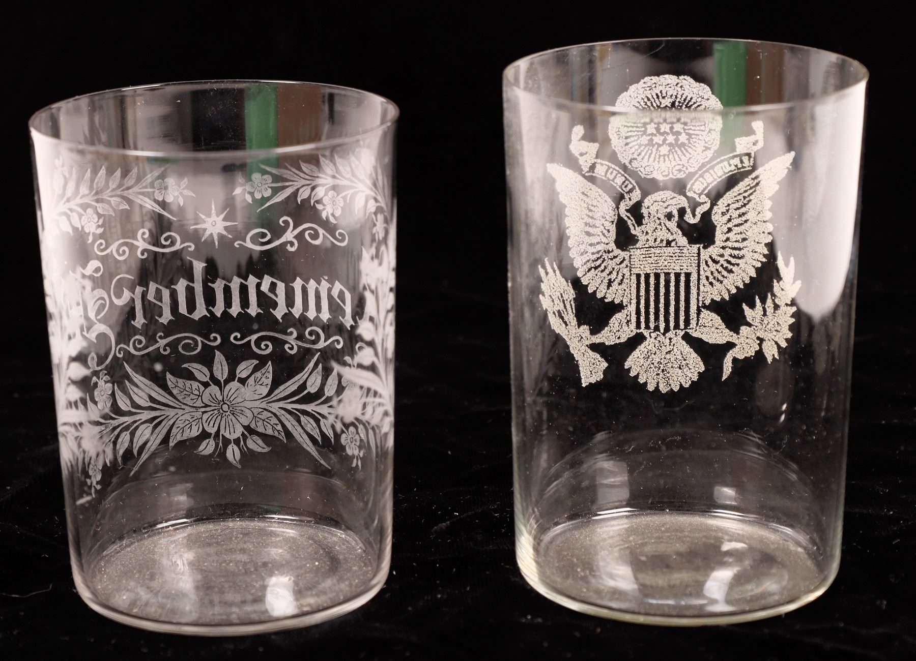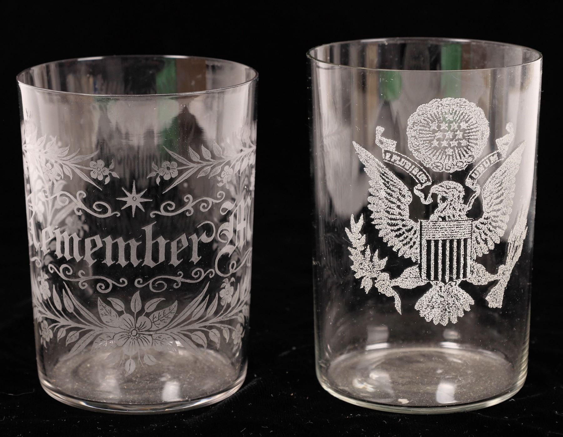 c. 1890-1910 Thin side beer glasses. Remember Me and US Eagle. 3.75" tall. No apparent chips or cracks.