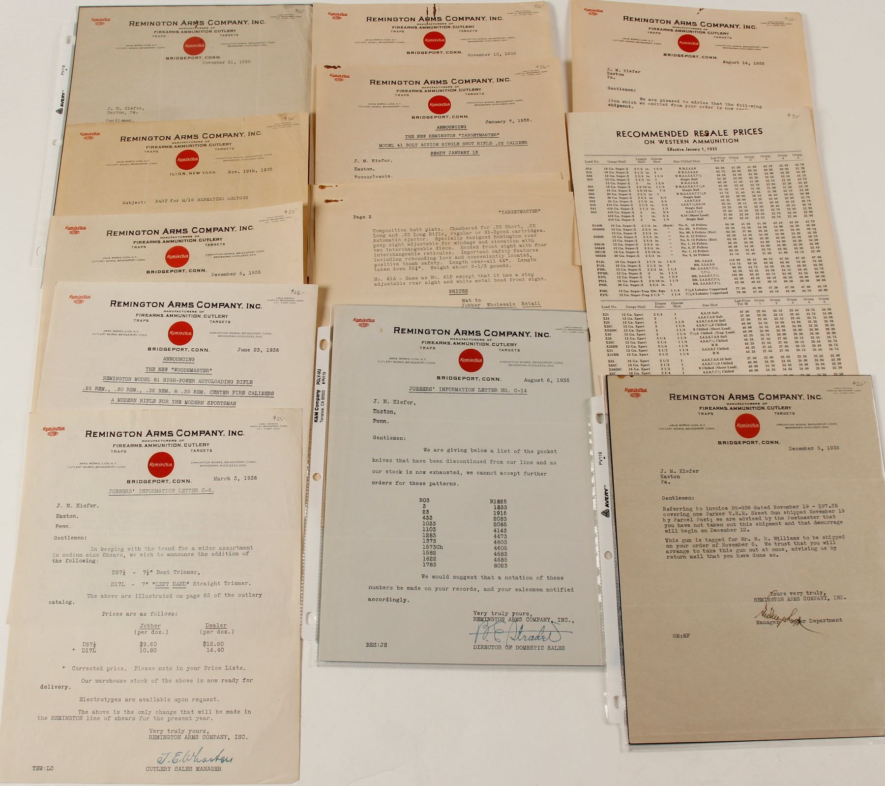 Ten items. Includes a price list effective 1935. All items are addressed to JM Kiefer of Easton, PA. Mostly about shipping items and cost to ship. Includes a list of pocket knives. Letter advertising the"New Remington Targetmaster, model 41 bolt action single shot rifle .22 caliber." Also an announcement for the Remington Model 81 high power autoloading rifle. Interesting set of letter between the Remington Company and a dealer.