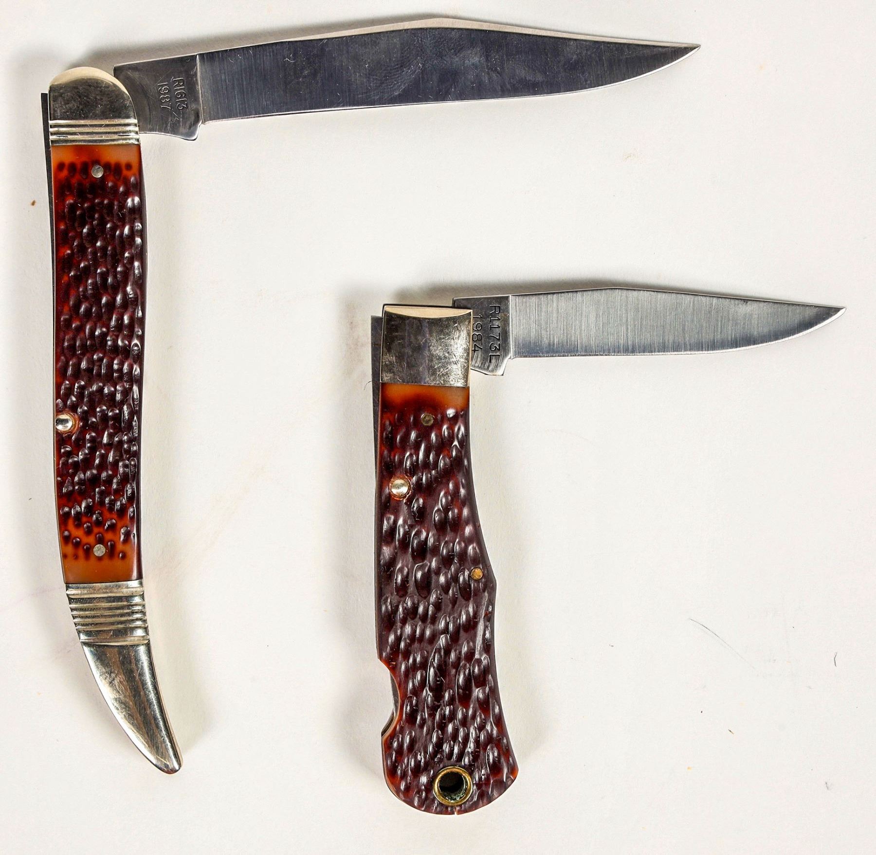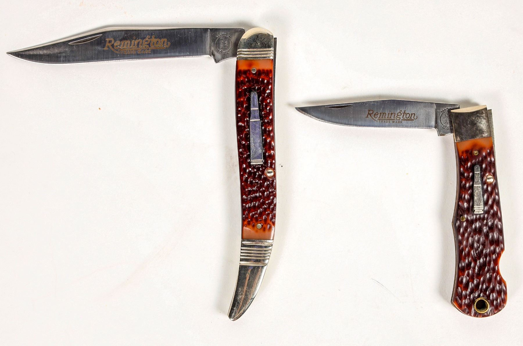 This group has the Remington Baby Bullet knife model R1173 and the Fisherman R 1613. Both are like new condition with boxes and paperwork. The Baby Bullet lockback has a small crack in the delrin at the lanyard hole on both sides which is common on his model. At 3.625 in. closed. The R 1613 Fisherman is at 5. in overall length closed. Please see photo for details.