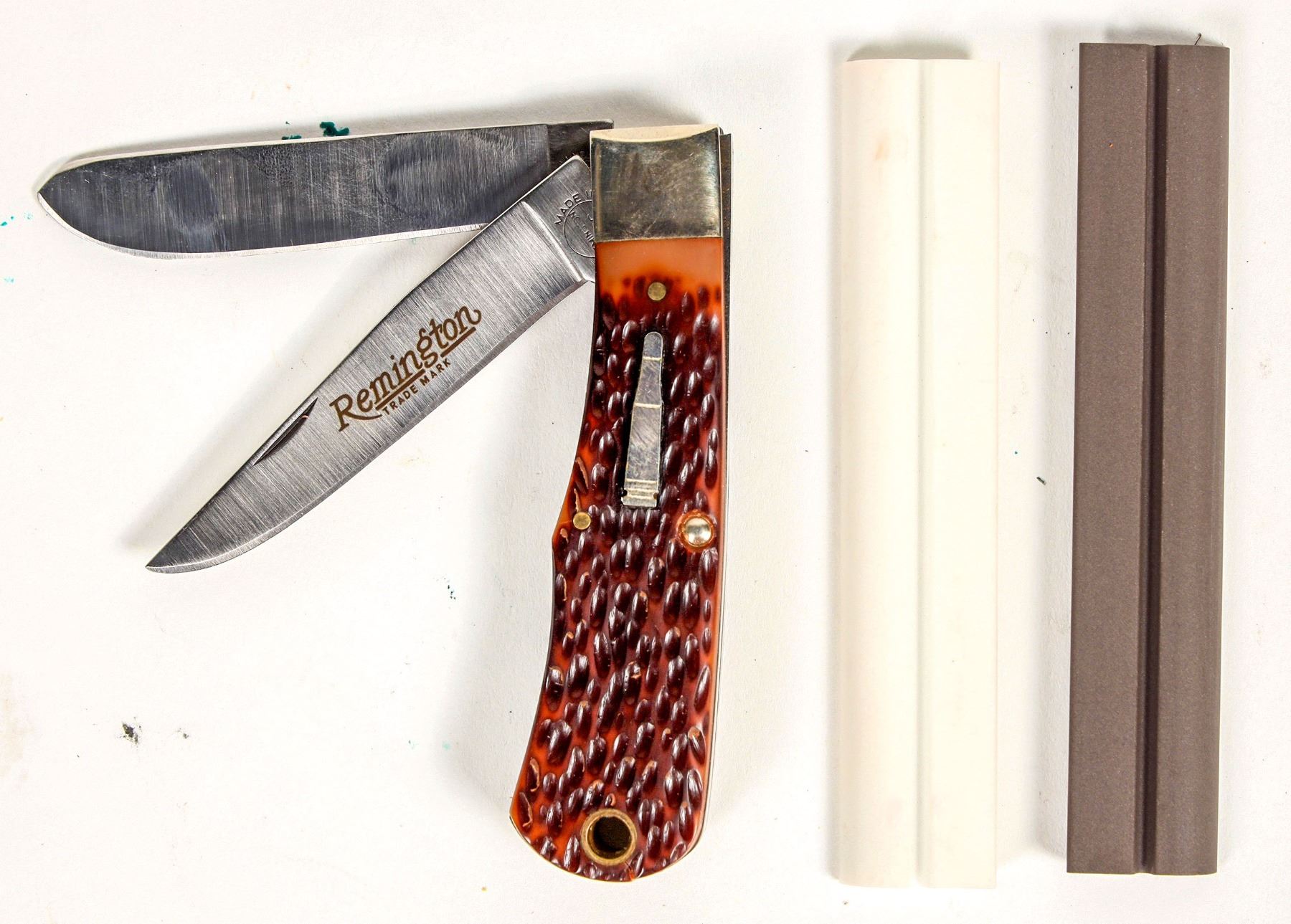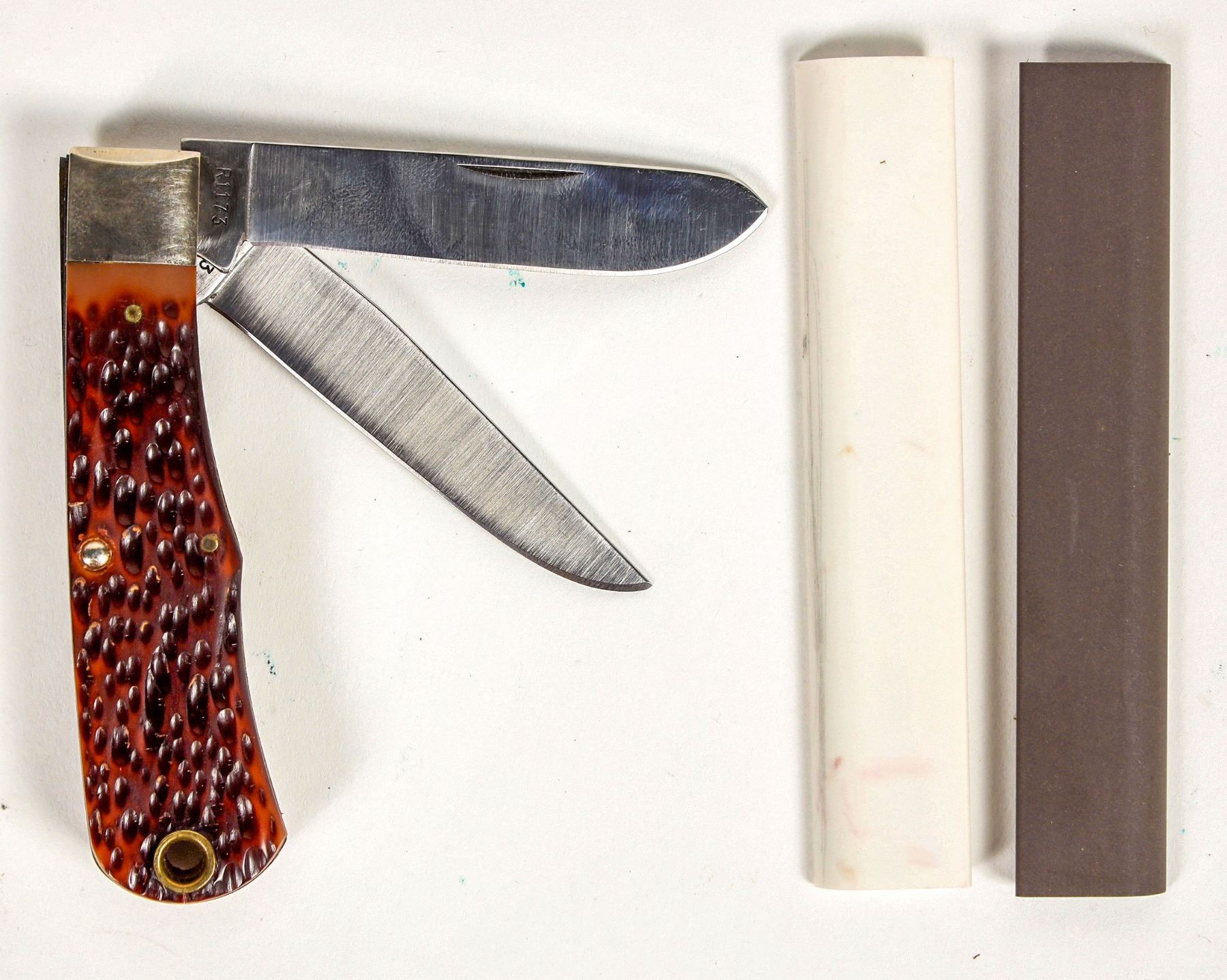 This lot has a Remington bullet knife model R 1173, with the two usual cracks at the lanyard hole with box and paperwork. The is a leather slip with two sharpening stones for serrated blades in like new condition. Please see photo for details.