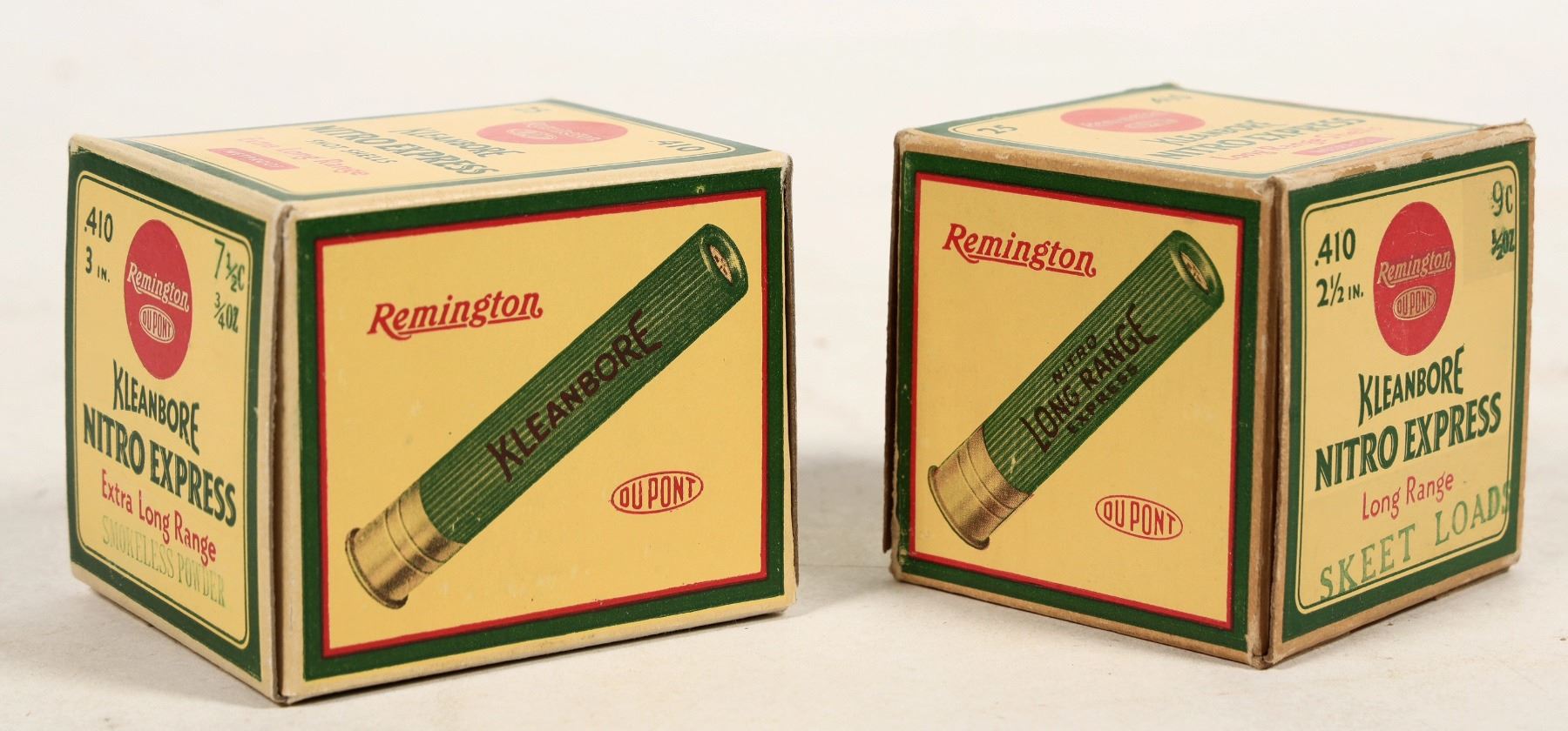 This lot holds two boxes of Remington DuPont .410 ga. vintage shotgun shells. One box is 2.5 in. X 9 shot and the second box is 3. in. X 71/2s. Boxes are full with 25 rounds each. In excellent condition. No sales to Connecticut, California, New Jersey, Illinois, Hawaii, New York, and Massachusetts. No international sales. Extra shipping charges apply. This ammunition is for collecting purposes only. Please see photos for details.