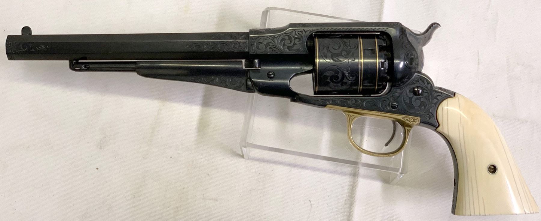 This Remington model 1858 percussion pistol in .44 cal. has been restored to its original glory. The gun is heavily engraved at C-D level for coverage and richly blued. The cylinder has two gold bands and one platinum band. S/N 10848x. This gun was reportedly carried during the Civil War. It now wears two piece ivory grips that show patination and age without chips. This beautiful piece of American history wears an 8 in. barrel and a beautiful case hardened hammer. It does not appear to have been fired since restoration.