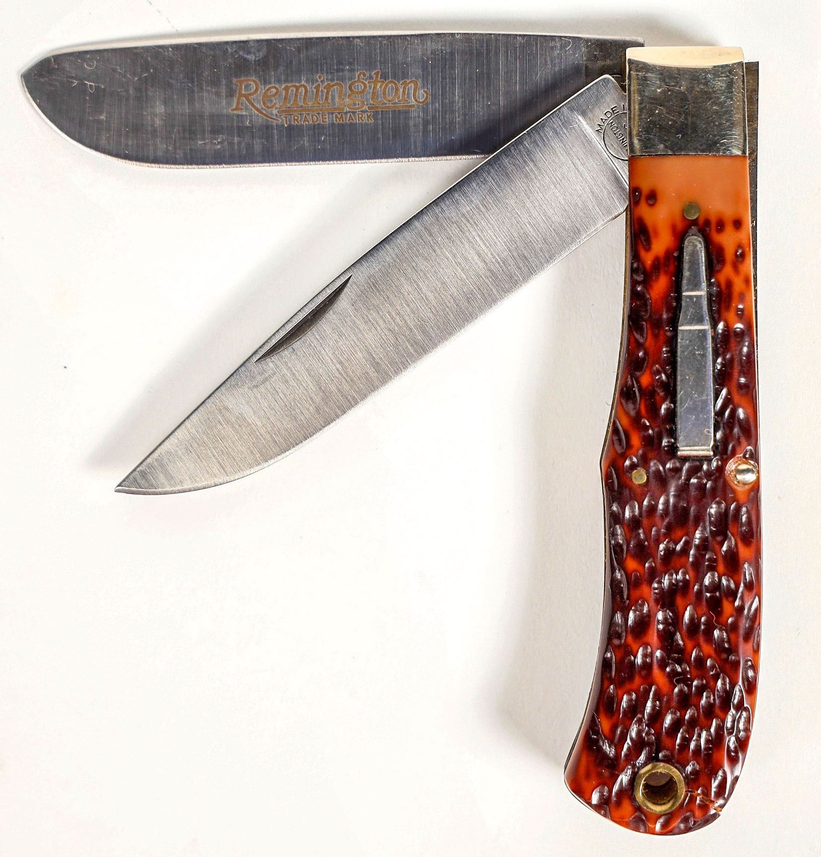 This is a Remington model R1123, reintroducing the Bullet knife. Original edge on delrin scales and original box with paperwork. There is a crack in the scales at the lanyard loop hole on both sides. Please see photos for details.