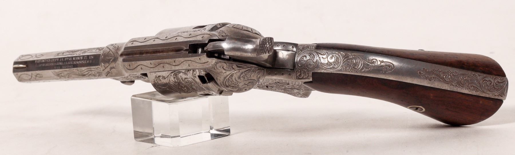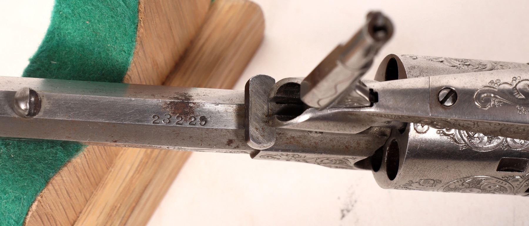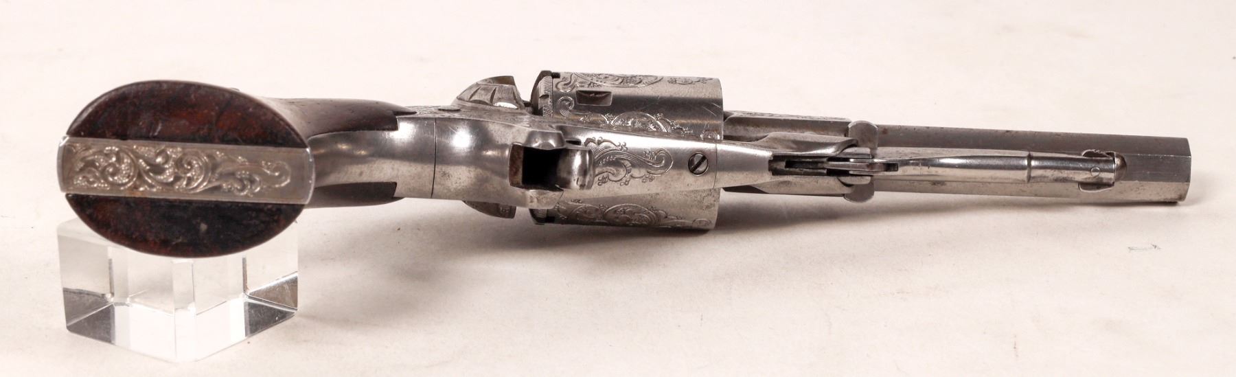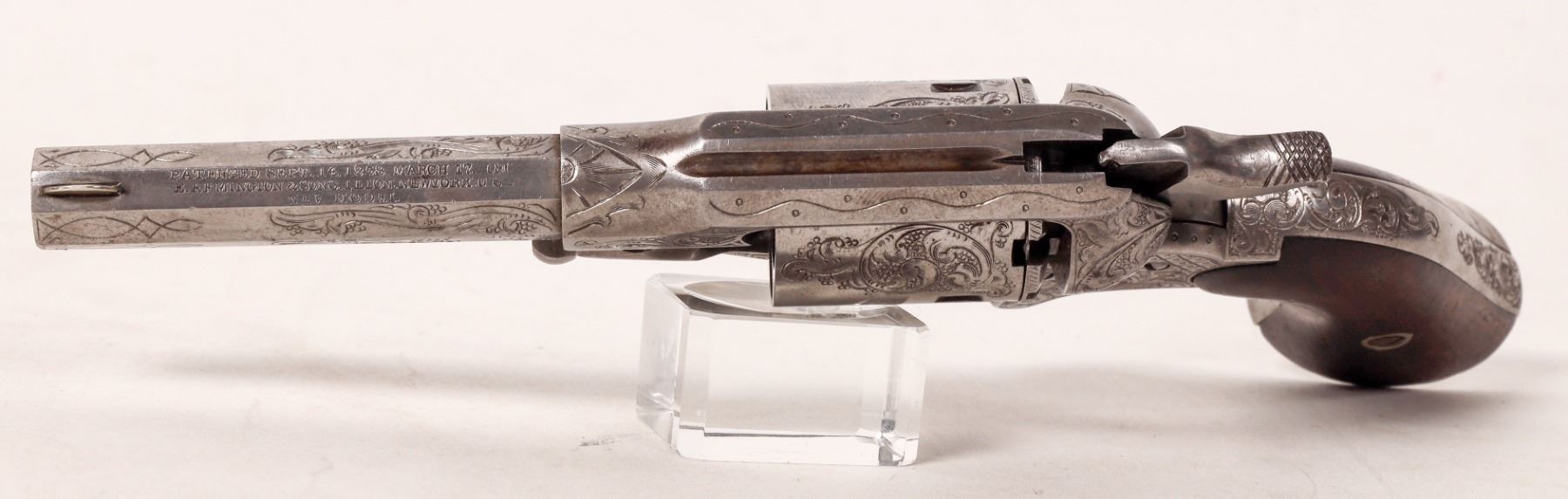 This pocket revolver is known as the Remington New Model Pocket revolver of 1863. It is a .31 caliber with a five shot cylinder that has been converted from percussion to rimfire. The gun is 8 in. overall length with a 3.5 in. barrel. The cylinder is two-piece for loading. The grips appear to be original walnut in a varnish finish that is in very good condition. The gun is factory engraved on a nickel finish. The engraving is in the style of Gustave Young (attributed to Gustave Young with donut scrolls and punch-dot no borders) however unsigned. S/N 23229 on the bottom flat of the barrel under the loading lever. In working order and in-time. Handling wear on the grips, 98 % nickel finish on metal parts. This firearm is an antique and no attempt has been made to fire this gun to confirm its mechanical integrity. Nor should this gun be fired without the examination by a qualified gunsmith. Any attempt to fire an antique gun is at the risk of the owner and not consistent with the value of the firearm. No FFL required. c. 1870's. No sales to New York, New Jersey, California, and Hawaii. (ref. Colt Percussion Engraving Styles, Jordon, 2022, KAW)