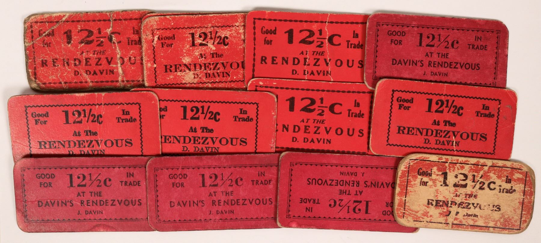 Lot of 13 cardboard tokens. Three different, some well used. GF 12 1/2c at D. Davis' The Rendezvous. Ex: Ron Lerch Collection.