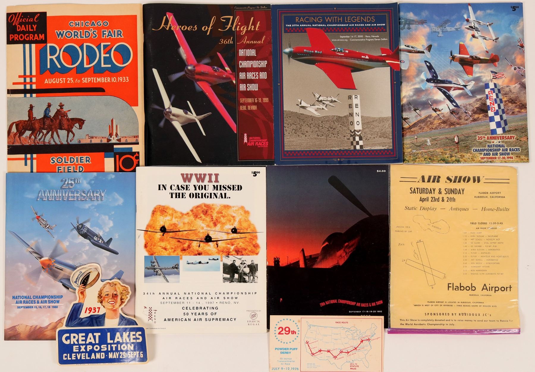 A group of Reno Air Race Magazines and other ad pamphlets that are air show or air race related.