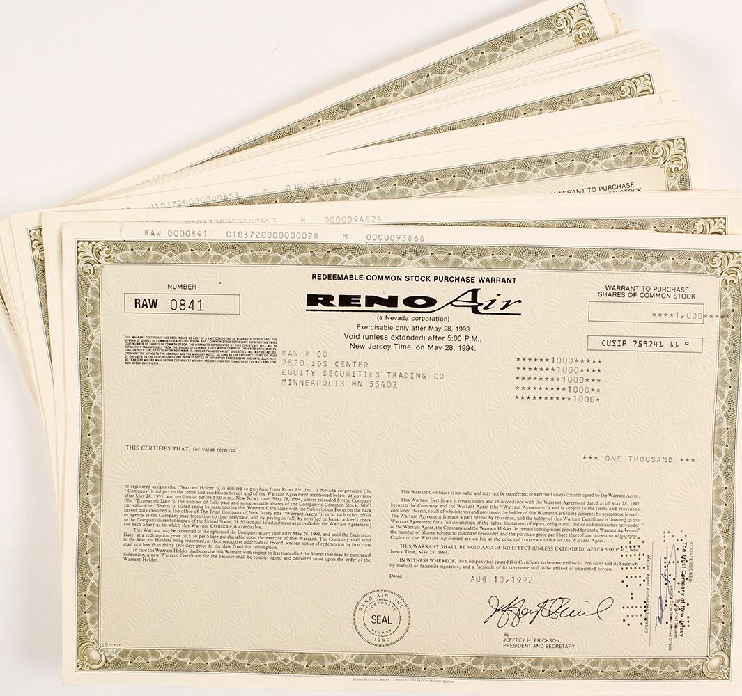 100 issued 1992-1993 Reno Air stocks. Date: Location: Reno, Nevada HWAC # 54953