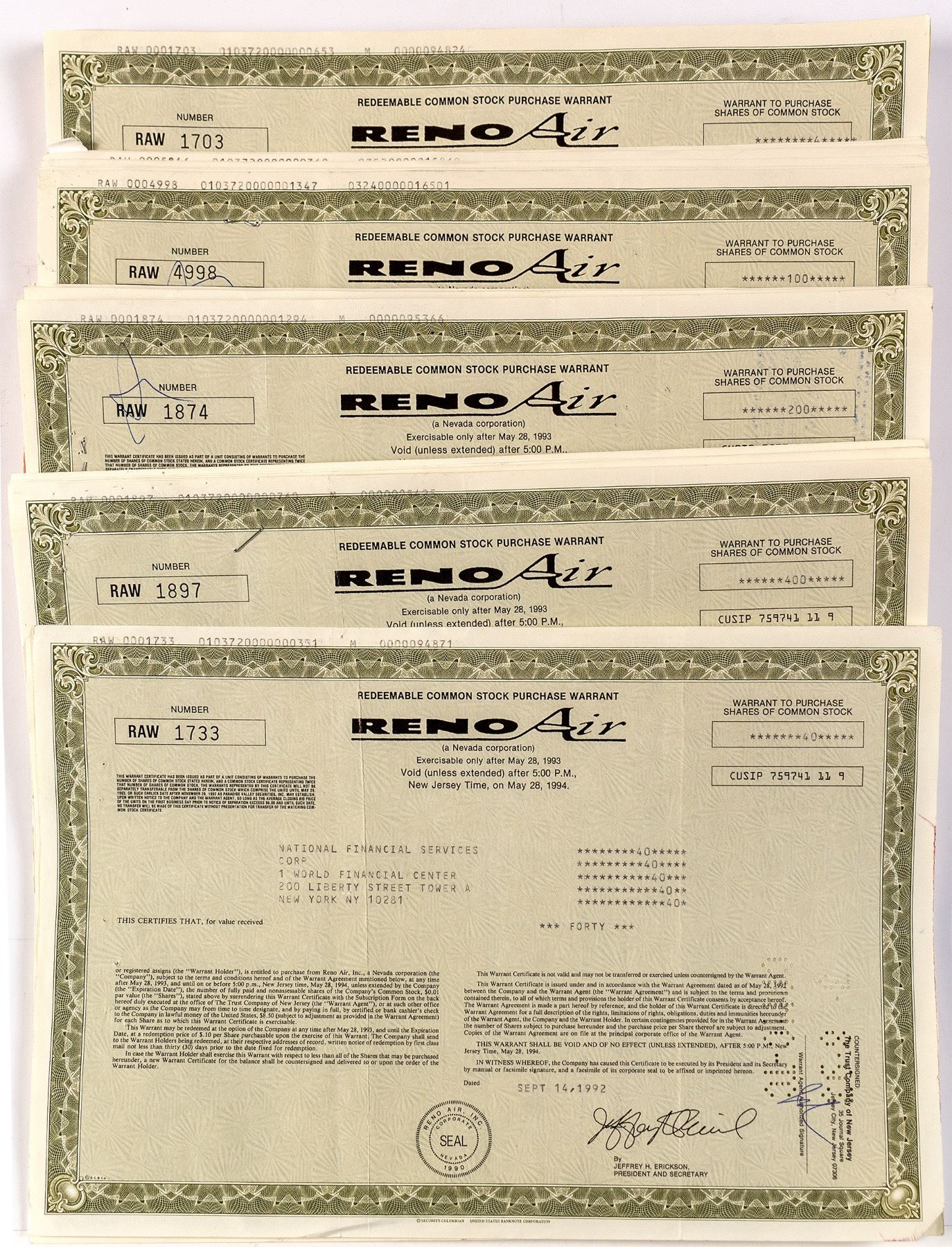 One hundred pieces of Reno Air stock certificates from the early 1990s. Rare. State: Nevada City: Reno HWAC#: 48241 Date: