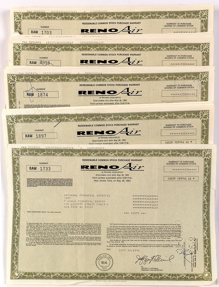 One hundred pieces of Reno Air stock certificates from the early 1990s. Rare. Date: Location: Reno, Nevada HWAC# 48241