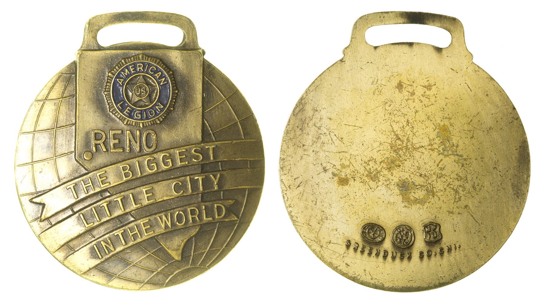 Bronze colored "The Biggest Little City in the World." Manufactured by the Greendcuck Company out of Chicago. 1.5". State: Nevada City: Reno HWAC#: 48400 Date: