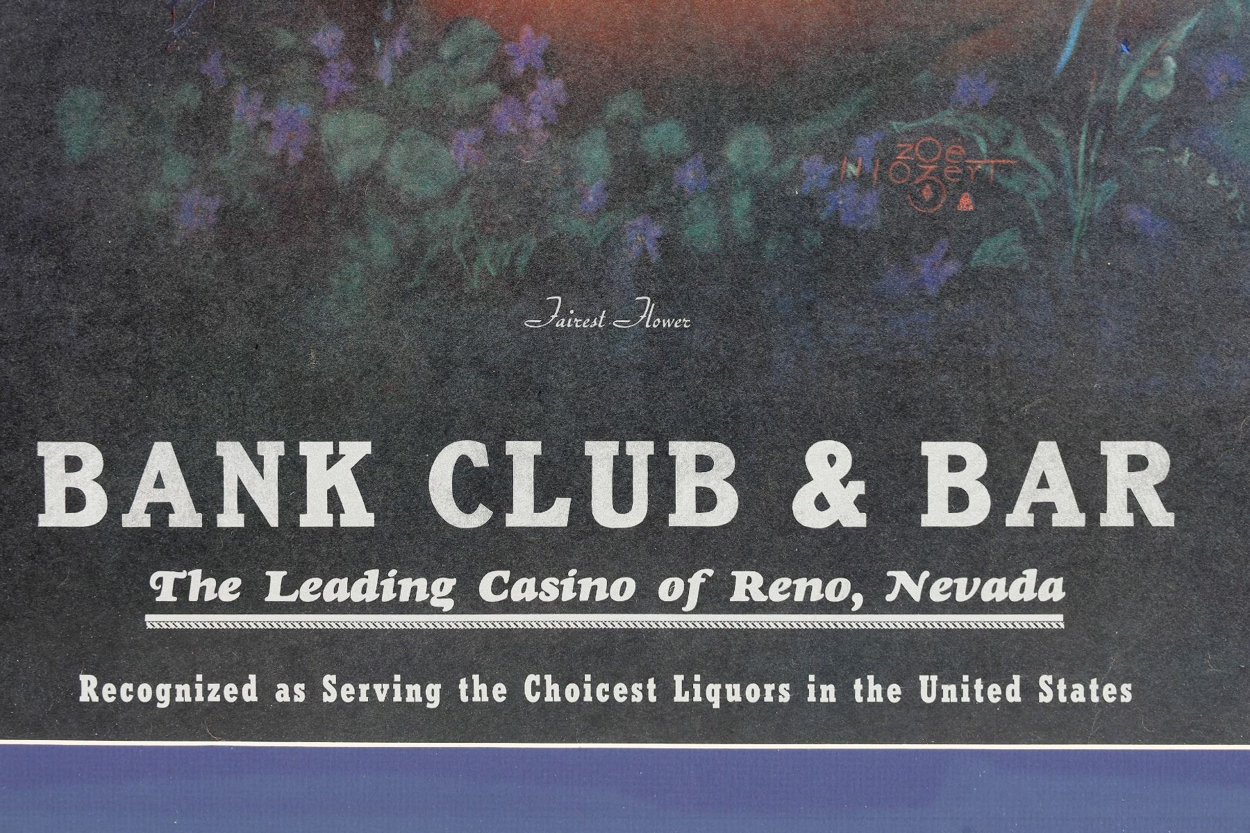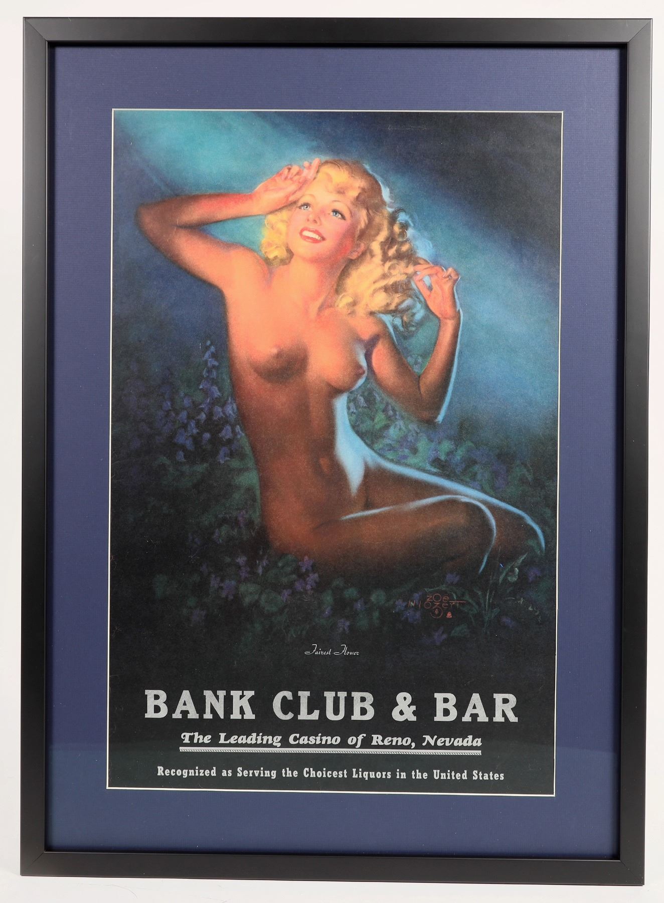 Reno Bank Club & Bar Pin Up Poster, 1946,. Known as the Definitive and Dangerous Casino in Reno at the time originally owned by George Wingfield. Became associated with "mob" during the 1940's. This poster titled "Fairest Flower" has provenance on the back about the poster and a calendar from 1946. IN excellent cond. Matted and framed. 22x29".