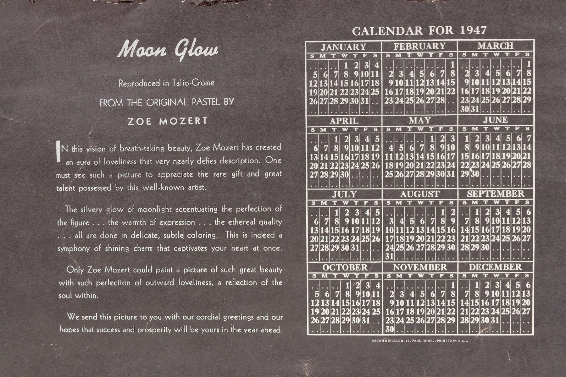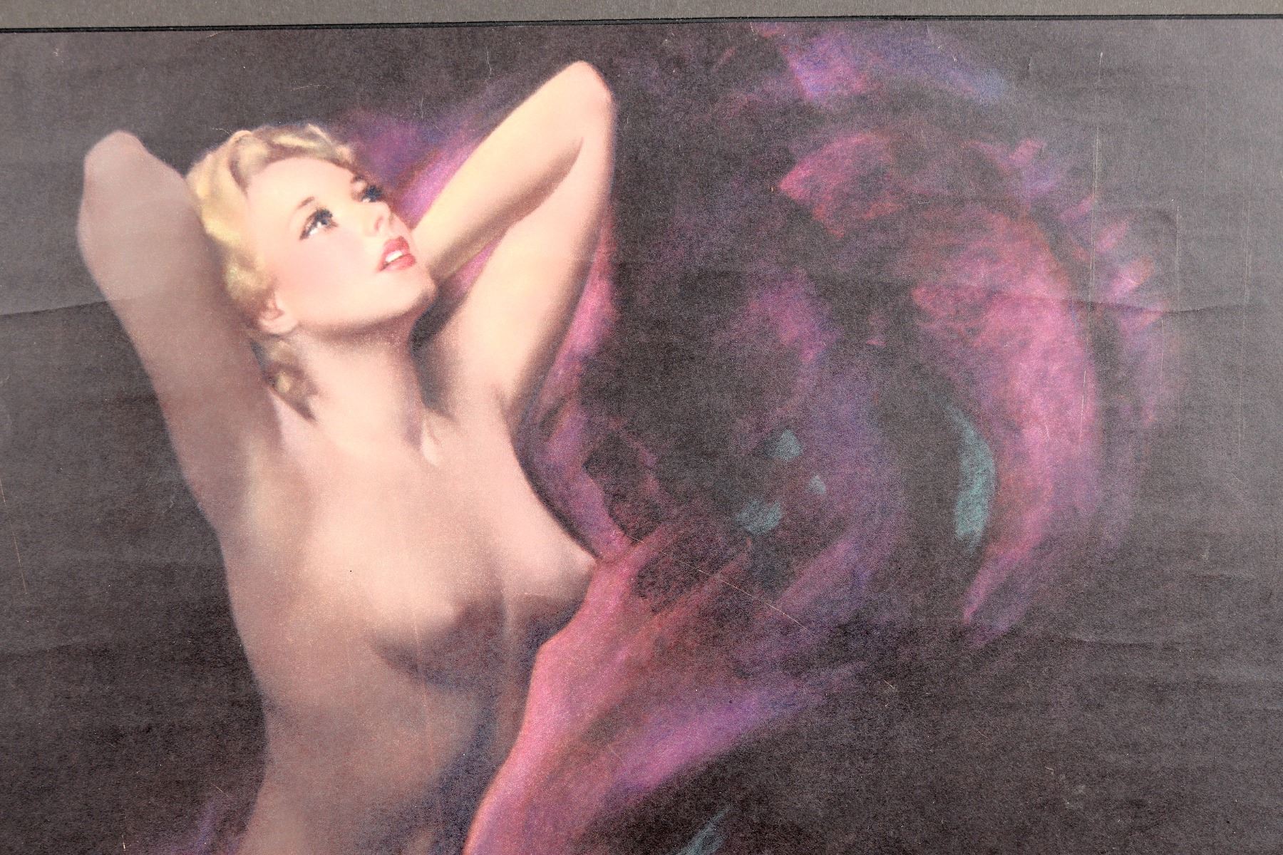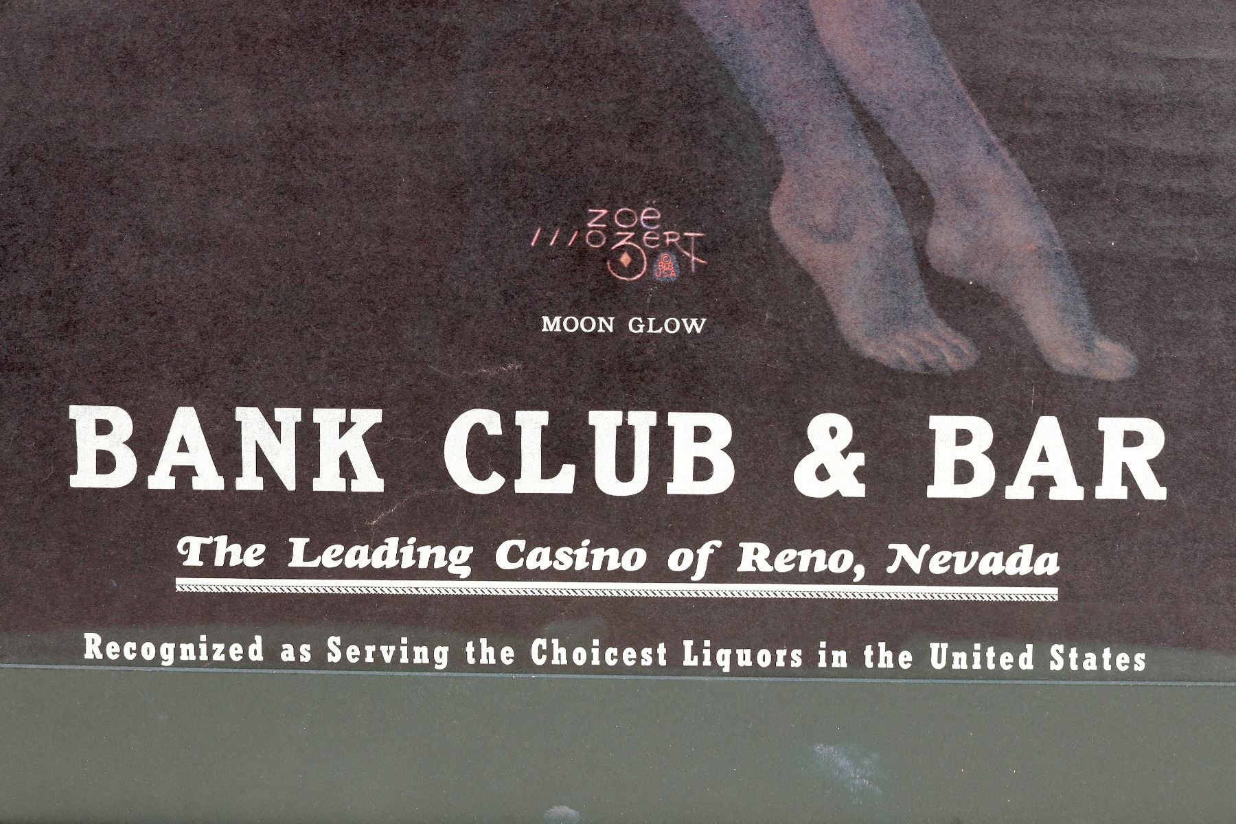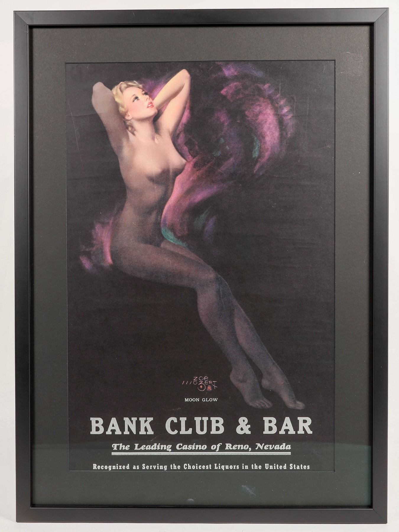 Reno Bank Club & Bar Pin Up Poster, 1947,. Known as the Definitive and Dangerous Casino in Reno at the time originally owned by George Wingfield. Became associated with "mob" during the 1940's. This poster titled "Moon Glow" has provenance on the back about the poster and a calendar from 1946. IN excellent cond. Matted and framed. 22x29".