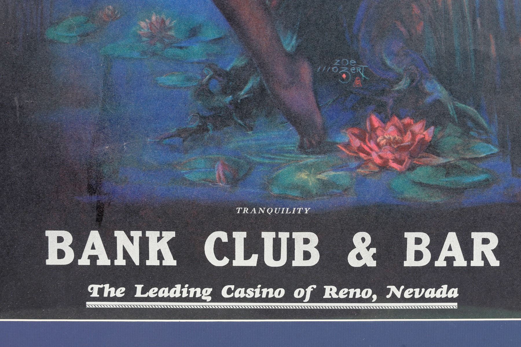 Reno Bank Club & Bar Pin Up Poster. No calendar. 22X29". Titled "Tranquilly" Matte and framed. no mounting hardware. The Bank Club has an interesting and nefarious background. Originally owned by George Wingfield. Run by William Graham and James McKay, that added to the colorful background of the owners involved with mobsters .