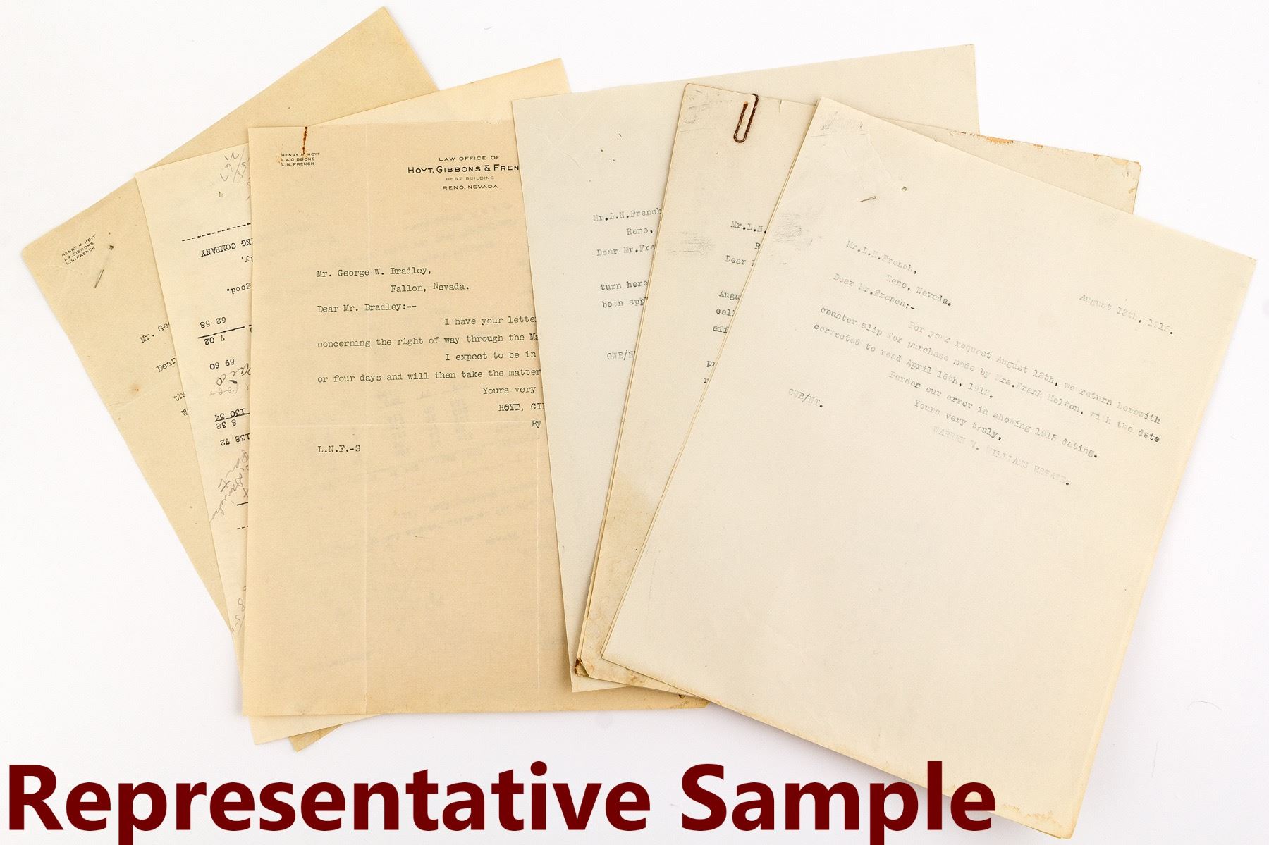 Over 150 pieces of paper from Grey Reid Wright, Emporium of Music, Nevada Hardware, Nevada Packing, Reno Mill & Lumber, Nixon National Bank, Eagle Salt Works, Swift & Company, WI Mitchell, Wood Curtis, Commercial Soap, Flanigan Warehouse, Daily Nevada State Journal, Western Ore Purchasing, etc. Many, many duplicates, but almost all addressed to Warren Williams of Fallon, Nevada. Interesting study of what one person bought from Reno in a year's time. State: Nevada City: Reno HWAC#: 46793 Date: Mostly c1907