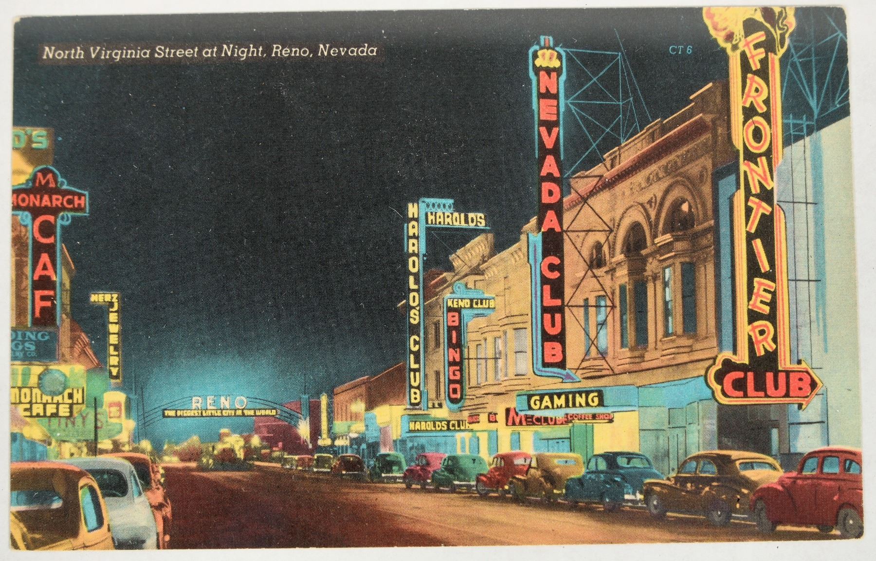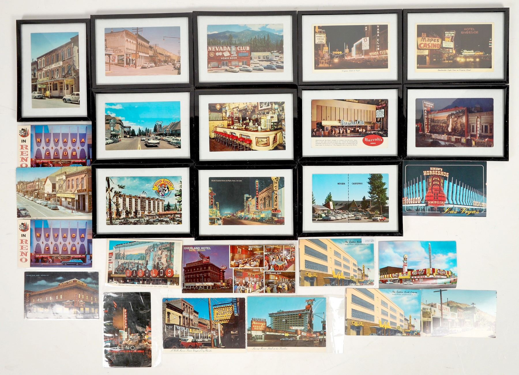 26 postcards of Reno casinos and Virginia City, 12 in frames. Harrah's Harolds, Cal-Neva, Overland Hotel, Nevada Club, Delta Saloon, Palace Club, Virginia Street at night.