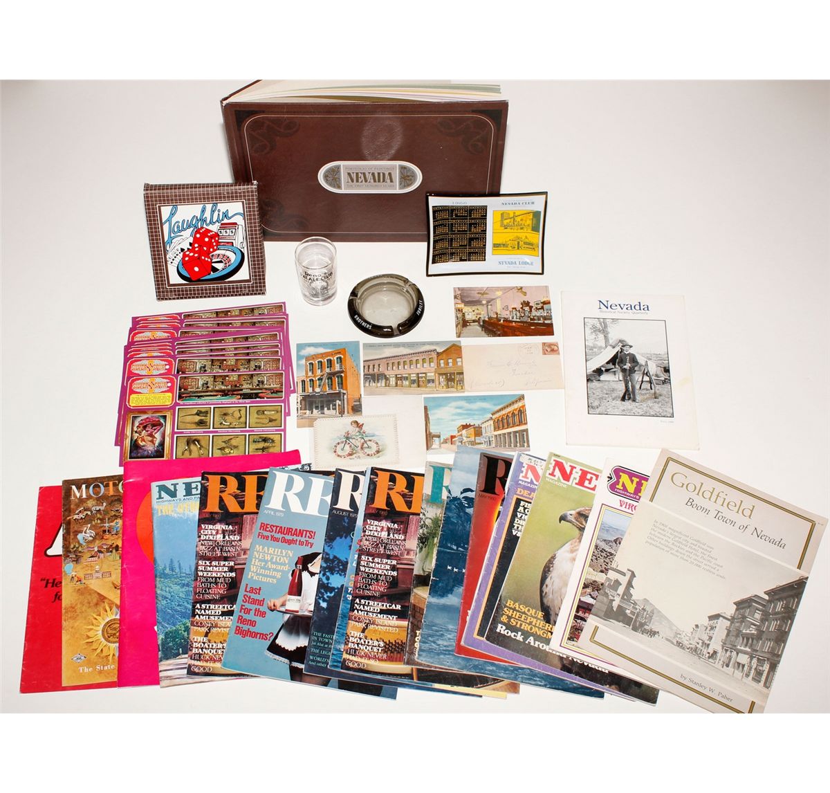 1966 Nevada Club/ Nevada Lodge tray with calendar printed on side; colorful Laughlin tile; Reno Palace Club etched glass; Pagni Brothers Jubilee ash tray; stack of Nevada and Reno magazines; oversized postcards from the Silver Spur advertising antique spur collection; 4 linen postcards for Virginia City; envelope from 1884 to Truckee; and a 1964 "A Portfolio of Paintings: Nevada, The First Hundred Years." Date: Reno NV hwac 20245