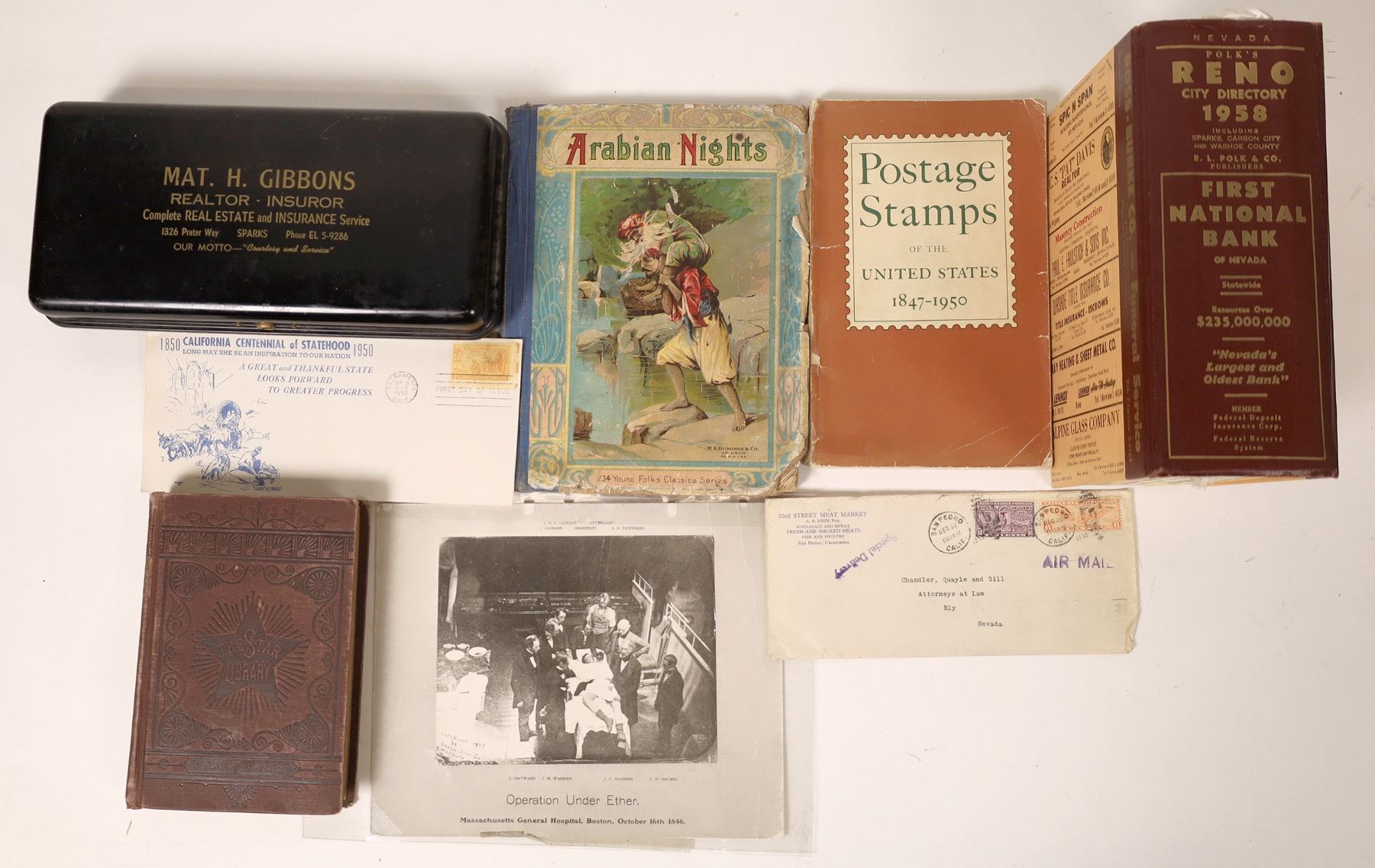 A variety of items, mostly from the Reno area. Included are a city business directory from 1958, a first day issue of a postal cover celebrating California's Centennial of Statehood, a postage stamp guide covering 1847-1950 and more.