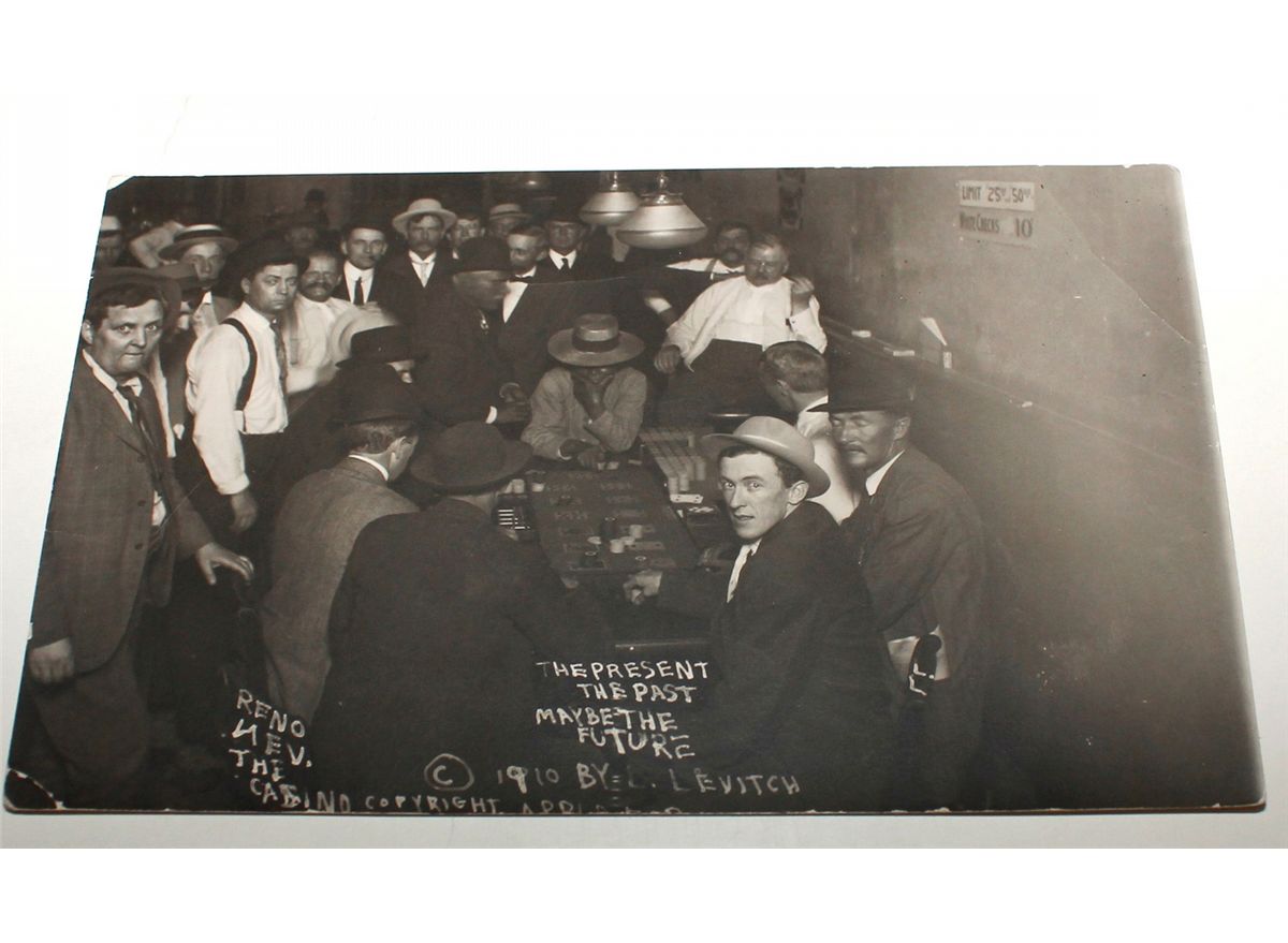 Titled "The Casino." Copyright B. Levitch. Shows men in suits at a gambling table. "The present, the past, and maybe the future." This was prophetic as gambling would become illegal later in the year! It would not be legalized again until 1931. VERY HISTORIC! Condition issues on corners - see photo. Date: 1910 Reno NV hwac 20042