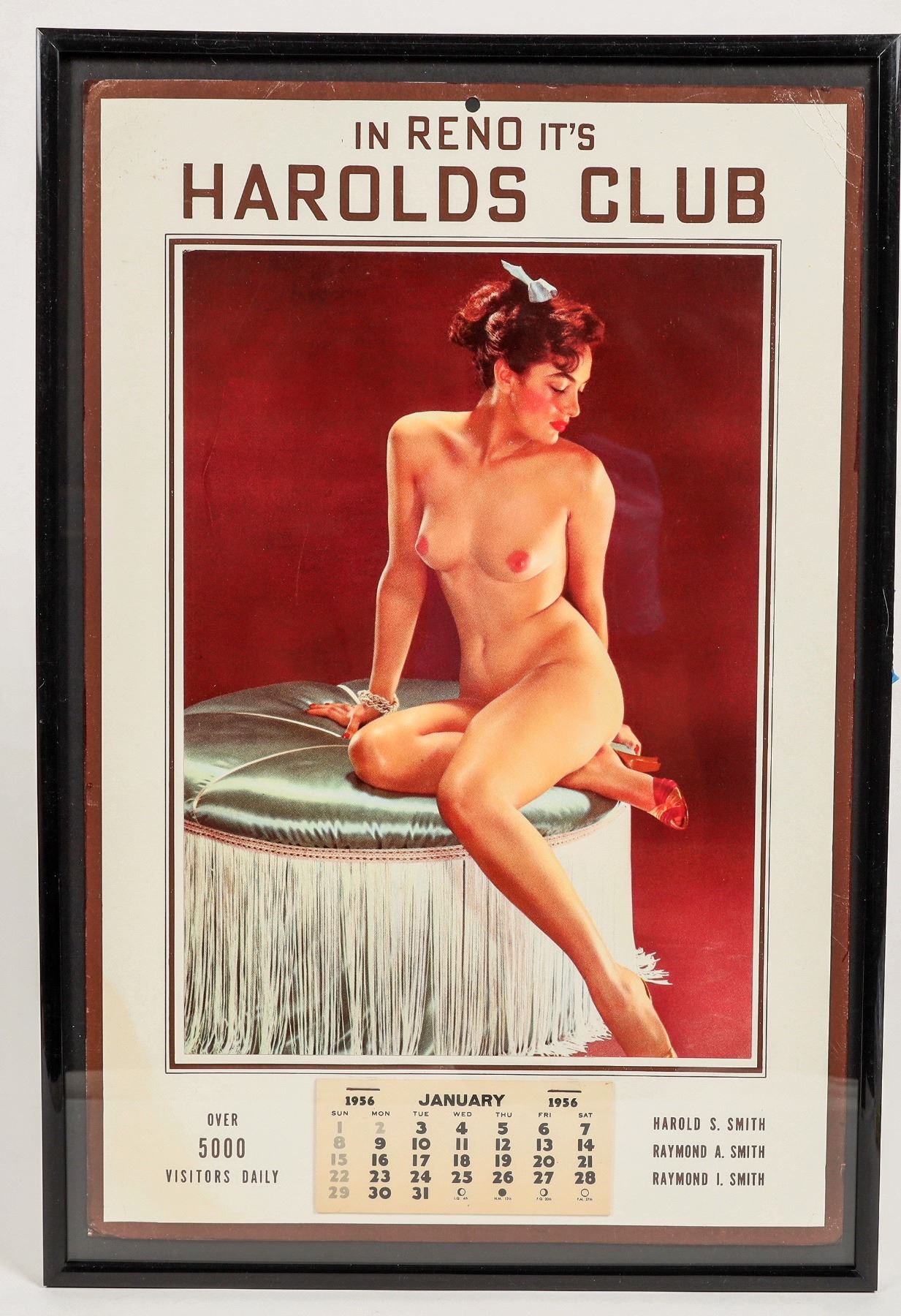 Reno Harold's Club Calendar 1956. This matted and framed, w/mounting hooks on back, covered in protective bubble wrap. In near new condition. 12X16.5". Calendar start w/January.