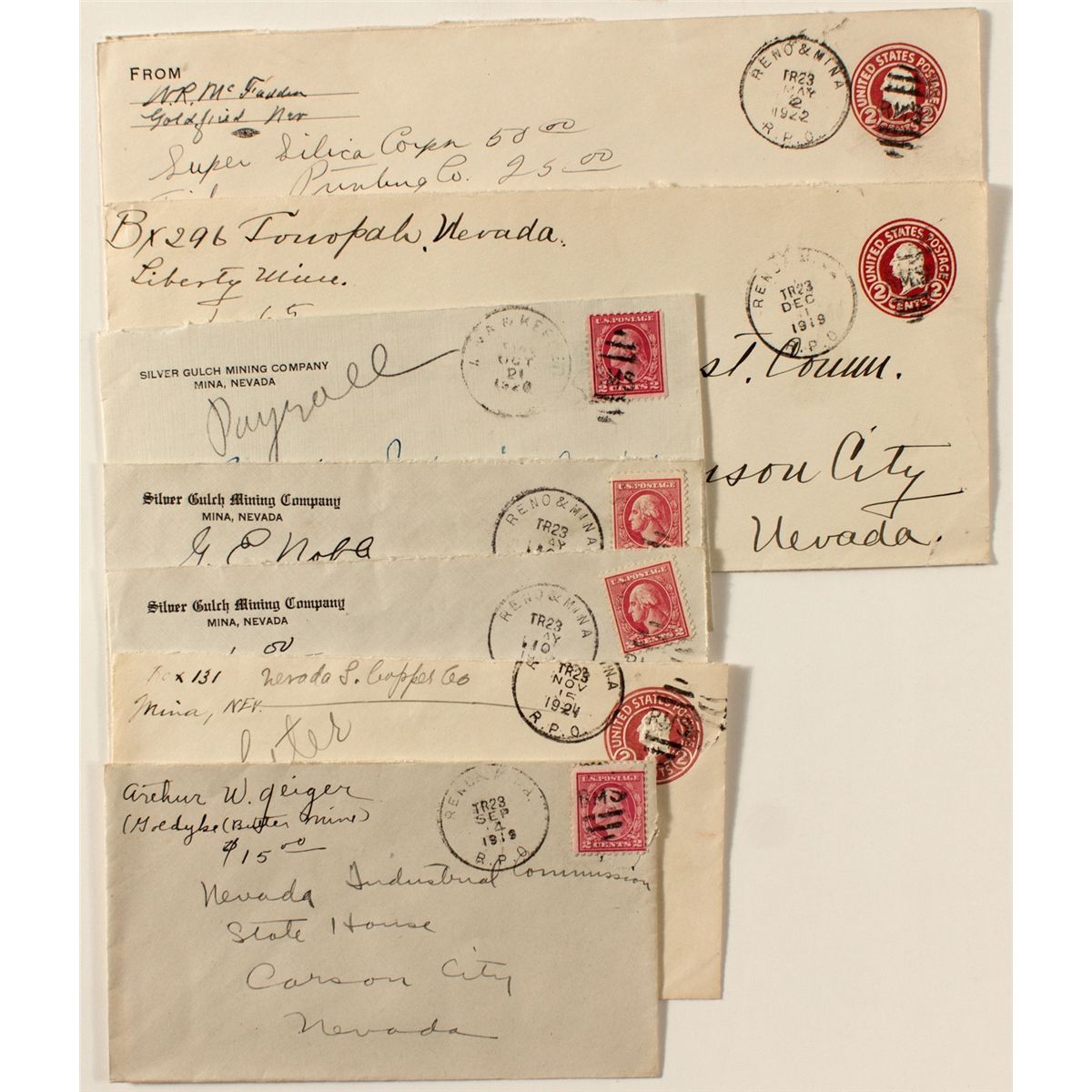 One Mina & Keeler on a Silver Gulch Mining Company corner advertising cover. 6 Reno & Mina RMS cancels. Includes Silver Gulch, Liberty Mines, Nevada Copper, etc. Strikes very from very good to weak. Date c1920 , NV hwac 20089
