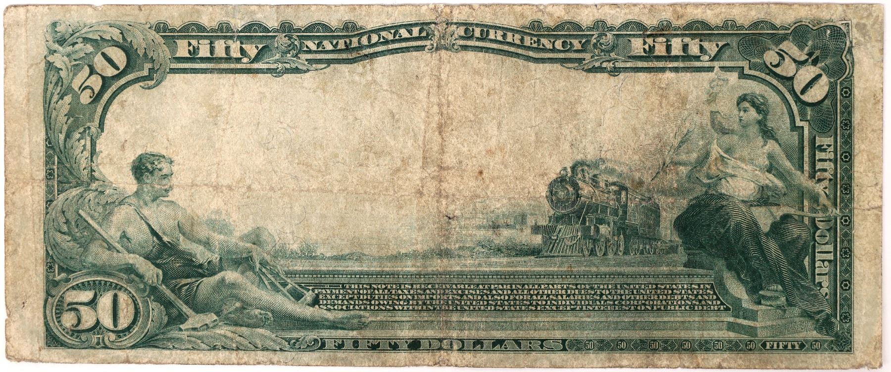 Reno, NV - $50 1902 Plain Back Fr. 682 The Reno NB Ch. # 8424 S/N 1276. Note Grades Fine. This is as the prior (3) notes, signed as President, by the legendary George Wingfield, who rose from dealing Faro at a Tonopah casino to the richest man in Nevada from 1902 to 1907. Long associated in business and politics with U.S. Senator George S. Nixon, Wingfield moved to Reno in 1908 and became active in banking, ranching, and hotel keeping. Although much of his fortune disappeared during the Great Depression, Wingfield remained a political power in Nevada for years thereafter. High denomination notes as is this $50.00 from this bank are scarce.