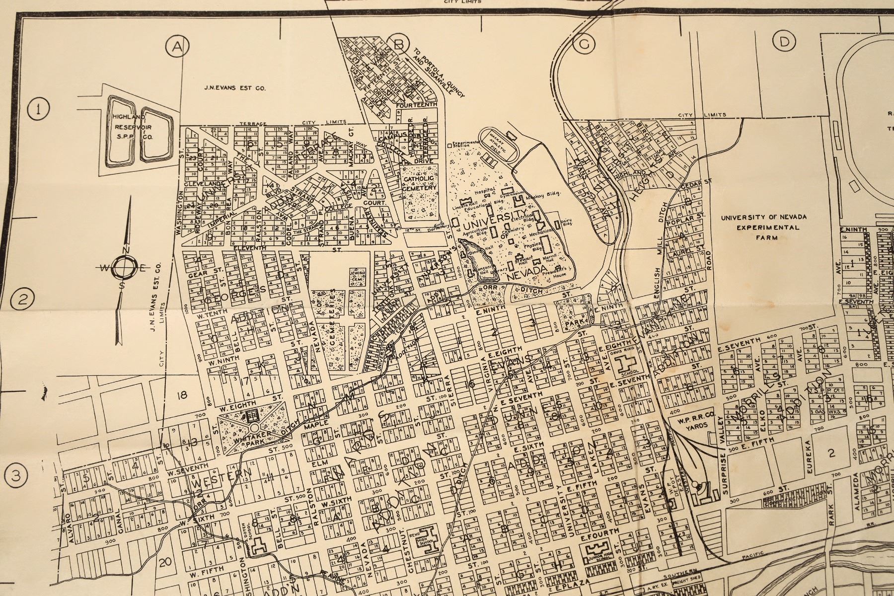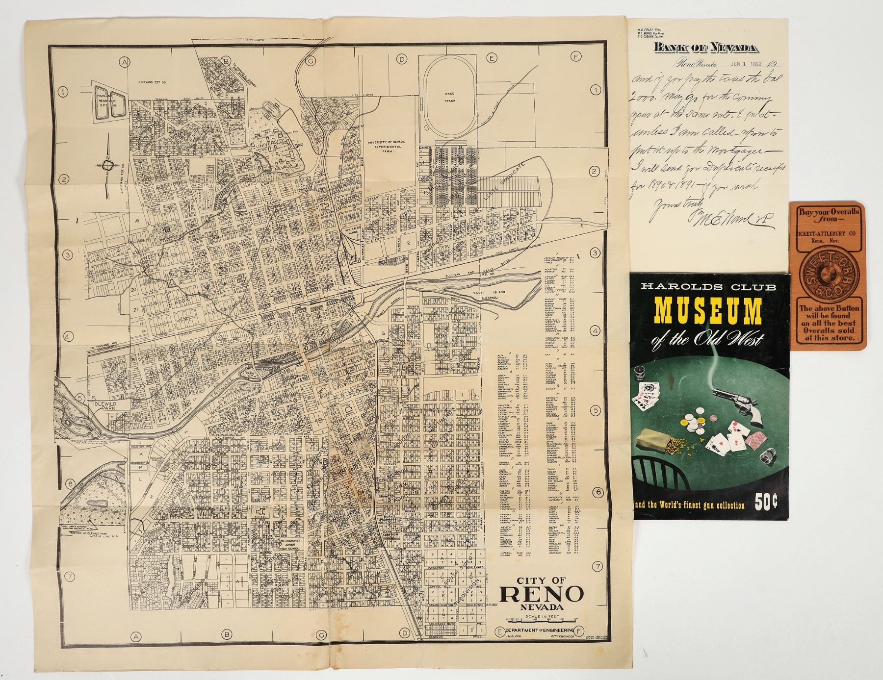 Lot of 4. 1) 1931 City of Reno map from Dept. of Engineering. 23.5 x 22" 2) Harolds Club Museum of the Old West brochure featuring gun collection. 1950s? 3) 1892 Bank of Nevada, Reno letterhead. 4) Pickett-Attlebury Co. booklet.