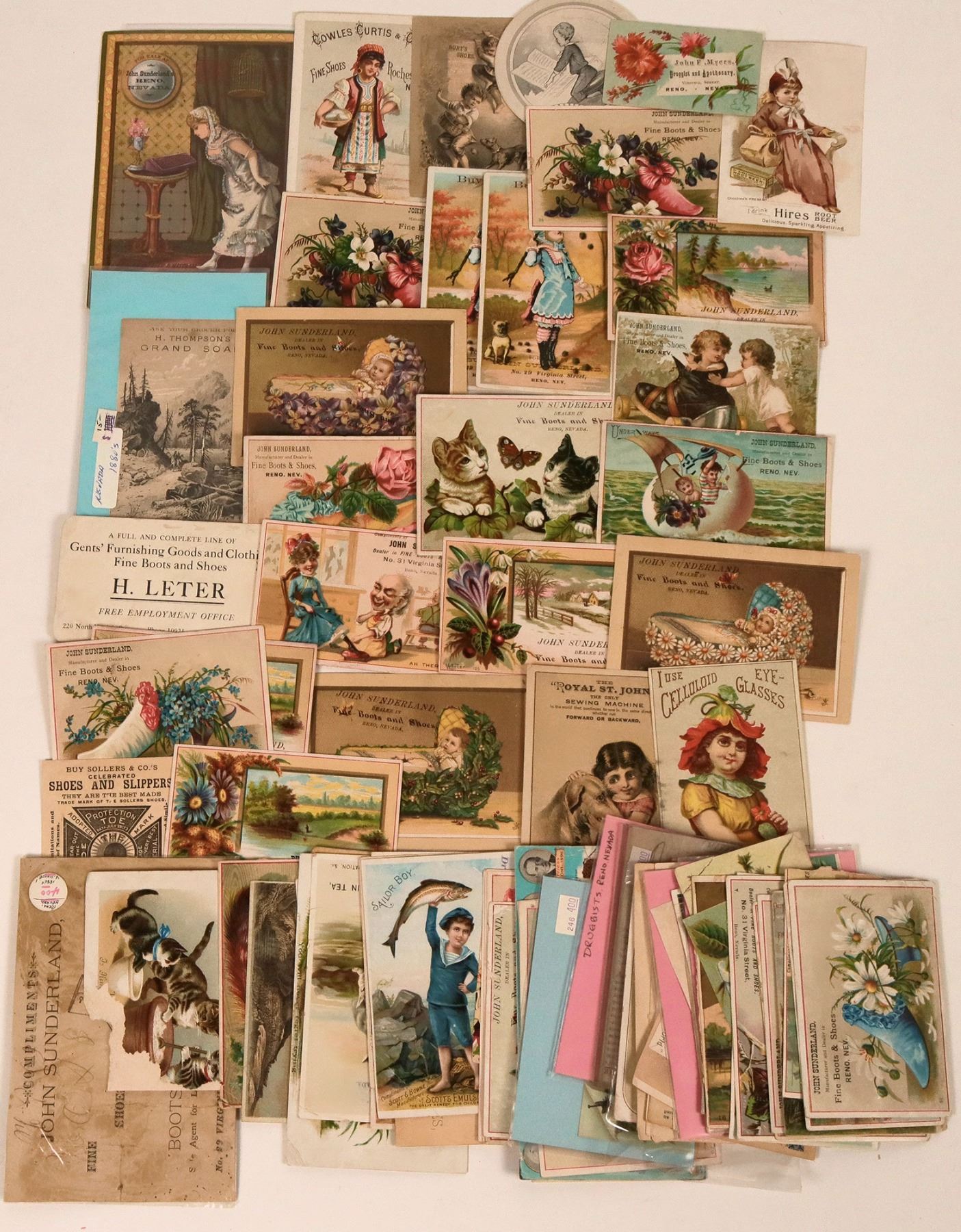 Lot of 83 incl. an ink blotter. Includes: many for John Sunderland; H. Thompson's Grand Soap; H. Leter; numerous for druggists Osburn & Shoemaker; Wm. Goeggel; Mrs. BE Hunter; HC Heidtmann; Abrahams Bros.; druggist JB McCullough; Matheson & McRae; AJ Clark; druggist John F. Myers; druggists Pinniger & Queen; Pepkins; druggist Wm. Pinniger; druggist RE Queen; plus an ink blotter for Cannan's McCullough Drug Company.