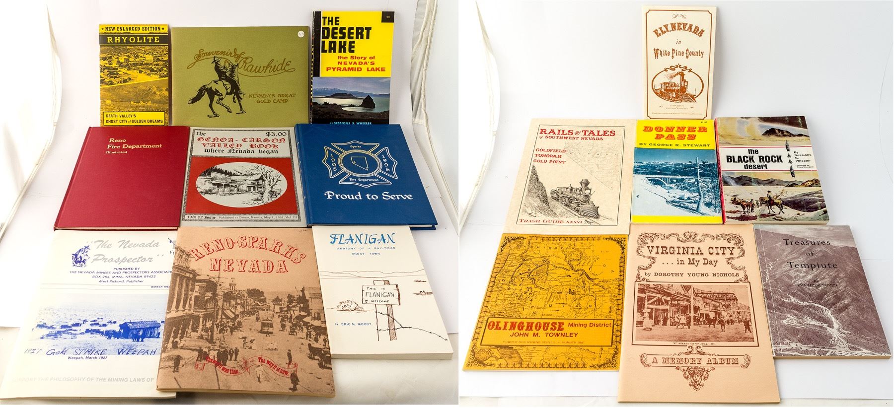 Lot of 16 books focusing on Reno/Sparks fire Department and surrounding history: 1) Treasures of Tempiute. 2) Donner Pass. 3) The Desert Lake: the story of Nevada's Pyramid Lake. 4) The Black Rock Desert. 5) Flanigan: Anatomy of a Railroad Ghost Town. 6) Reno Fire Department, Illustrated. 7) Ely Nevada in White Pine County. 8) The Nevada Prospector Winter 1982 Edition. 9) Olinghouse Mining District - Powder Box Mining Series - Number One.10) Souvenir of Rawhide, Nevada's great gold camp. 11)The Genoa - Carson Valley Book: Where Nevada began. 12) Enlarged Edition: Rhyolite, Death Valley Ghost City of Golden Dreams. 13) Reno Sparks Nevada. 14) Rails & Tales of Southwest Nevada: Goldfield Tonopah Gold Point Trash Guide. 15) Virginia city ...in My Day - A Memory Album. 16) 1905 to 1996 Sparks Fire Department Proud to Serve. State: Nevada City: Reno HWAC#: 48265 Date: