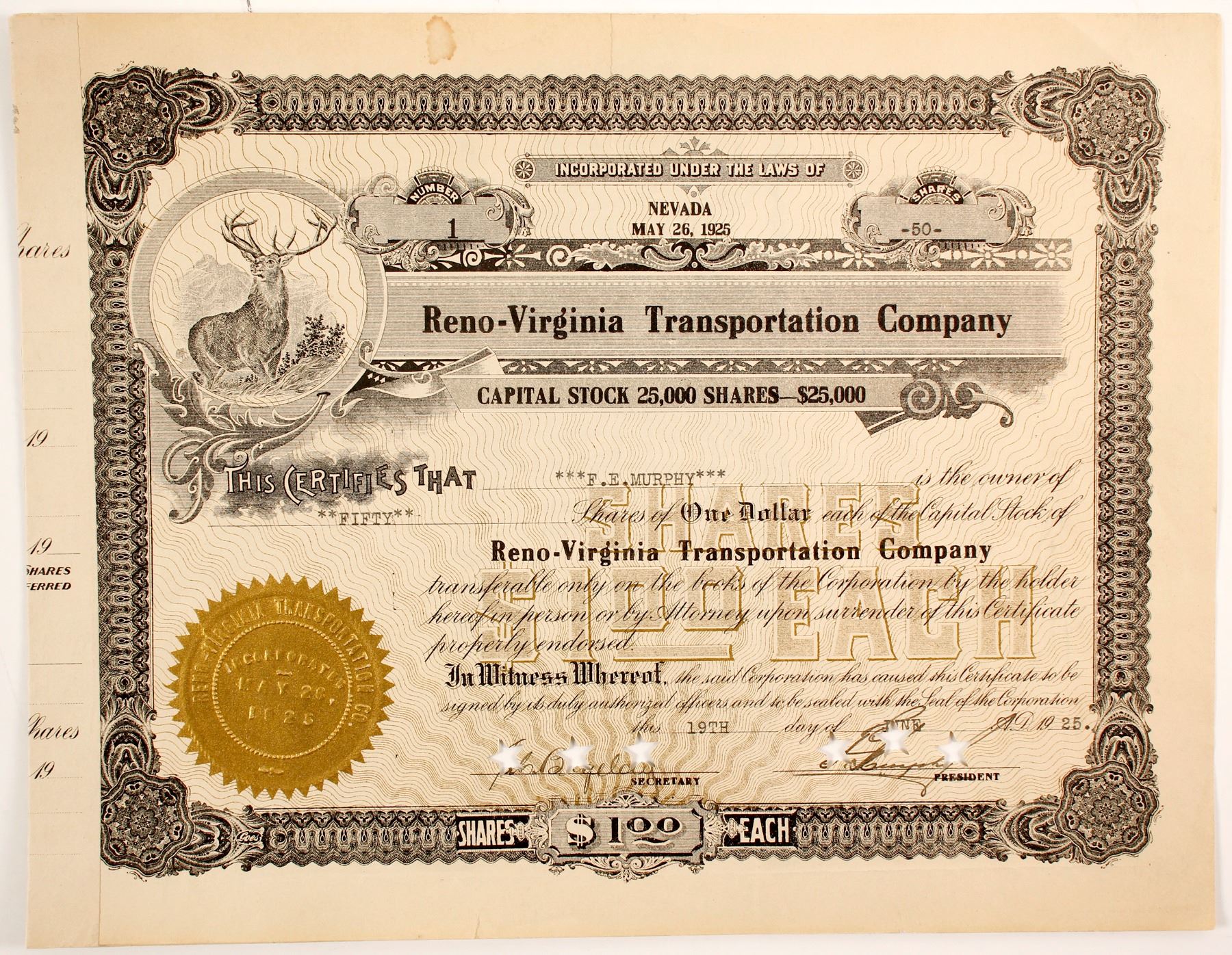 Certificate #1 - cancelled 50 shares of Reno-Virginia Transportation Co. issued to F. E. Murphy, Carson City, NV on June 19, 1925. Adhesive RN stamp. Inc. Nevada, May 26, 1925. Grey border with gold company seal. Vignette deer with antlers with mountains in background. This company, like many others of this time period, started small and may have only lasted a few years and maybe in a limited number of states. No information on the company as to dates of operation, owners, even states in some cases, earlier name and if they consolidated with another company, went into bankruptcy or just closed.