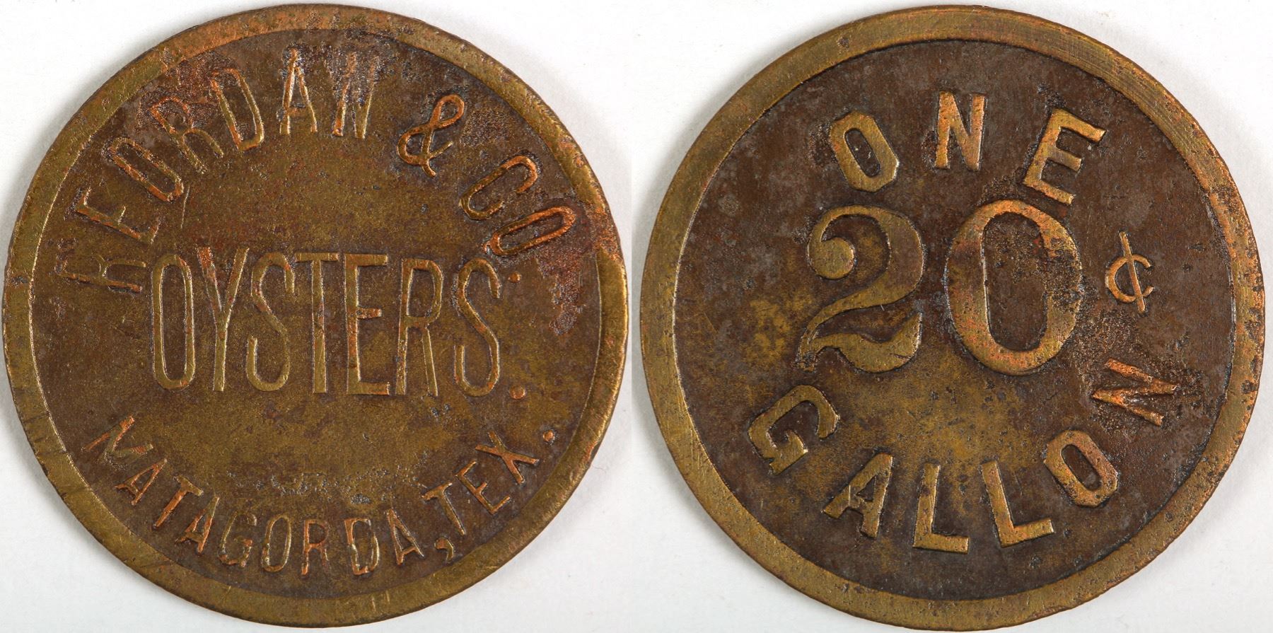 Rare round brass 25mm REORDAN & CO / OYSTERS / MATGORDA, TEX. // ONE / 20C / GALLON State: Texas City: Matgorda Date: HWAC# 62535