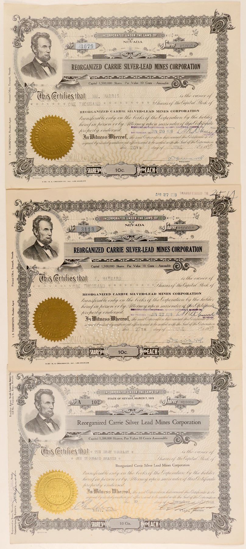 Lot of 3. Two issued in 1938, one in 1946. One is punch cancelled. All have black border and print with portrait vignette of Abraham Lincoln. Folds, light wear. The Carrie Mine was located in the Gilbert Mining District of Esmeralda County. In 1907, the mine was leased to H.M. Myers and Charles A. Bona as an Ag-Pb mine. They developed it as a turquoise producer. Ken Prag Collection