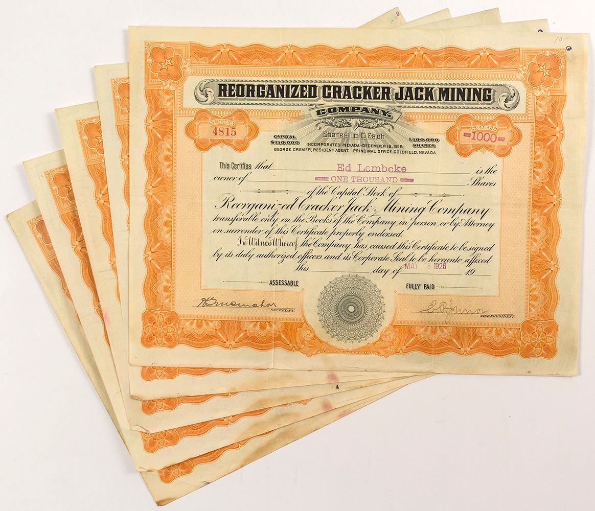 Goldfield, NV. 5 Issued 1921-1926 to Ed Lembcke. Some bottom toning. 8.25" x 11". Signed by president. City: Goldfield State: Nevada Date: HWAC # 51650